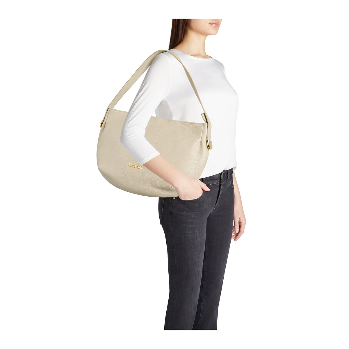 Hobo-Tasche aus weichem Kalbsleder mit Dollaro-Prägung in Grau, gestaltet in einem schlichten und modernen Design. Die abgerundeten Linien und das klare Profil machen sie zu einer vielseitigen Wahl – ideal, um Alltagslooks mit zurückhaltender Eleganz zu ergänzen. Leicht und geräumig verfügt sie über einen breiten Henkel für ein bequemes Tragen über der Schulter. Das goldfarbene Braccialini-Logo setzt einen edlen, unverwechselbaren Akzent. Ein Modell für alle, die Funktionalität suchen, ohne auf Stil zu verzichten.