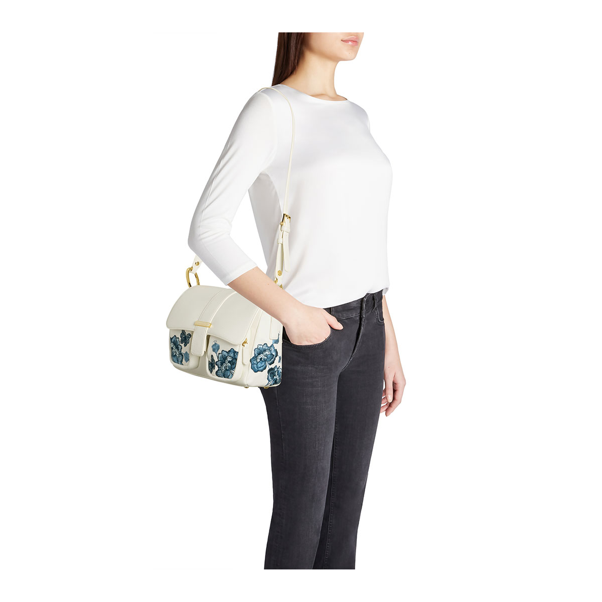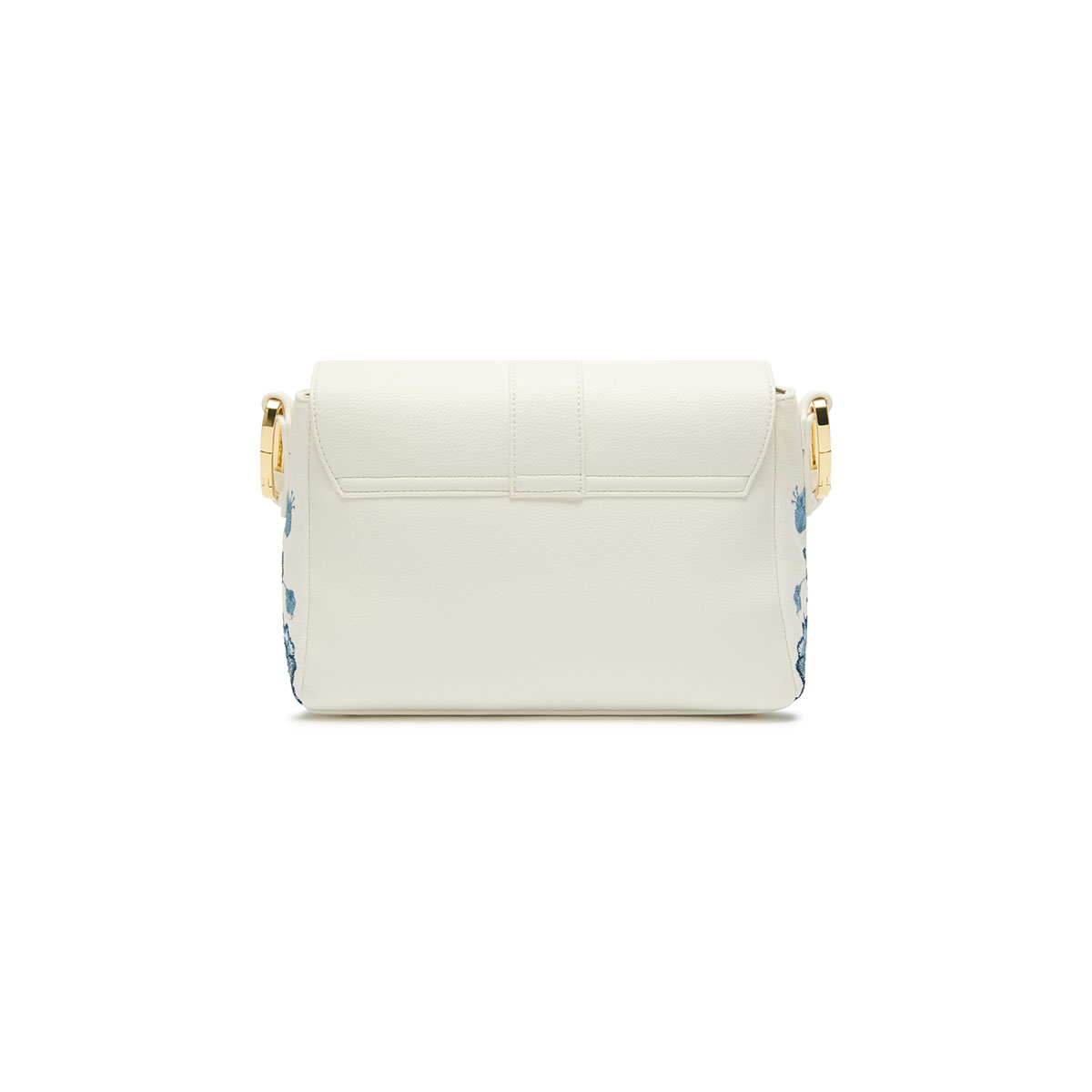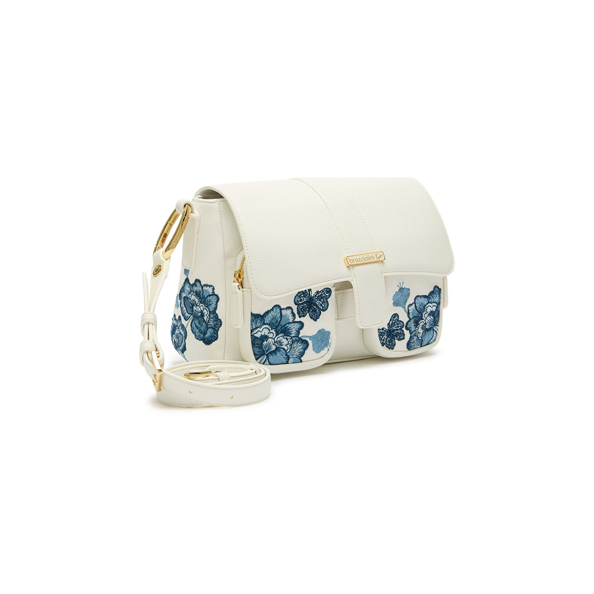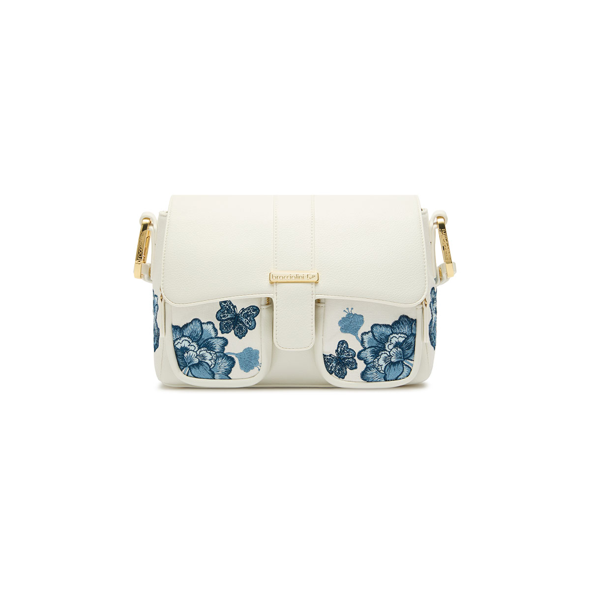In dieser Version setzt die Braccialini-Schultertasche auf einen farblichen Kontrast mit starker visueller Wirkung. Auf einem klaren, leuchtenden Optikweiß erblühen Blumen und Schmetterlinge in einem kühnen Elektroblau. Der Mix aus Stoff und Kunstleder unterstreicht die Strahlkraft des Prints und macht aus dem Accessoire mehr als nur eine Tasche: ein echtes Style-Statement. Die doppelte Fronttasche und der Überschlagverschluss runden das Design ab und schaffen die perfekte Balance zwischen avantgardistischer Ästhetik und Alltagstauglichkeit.