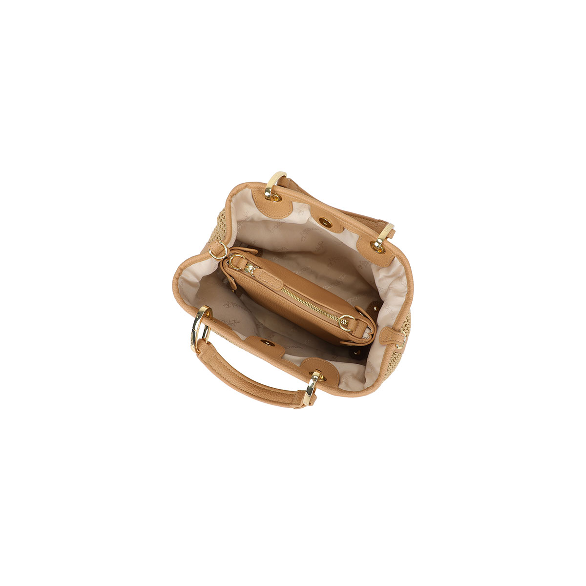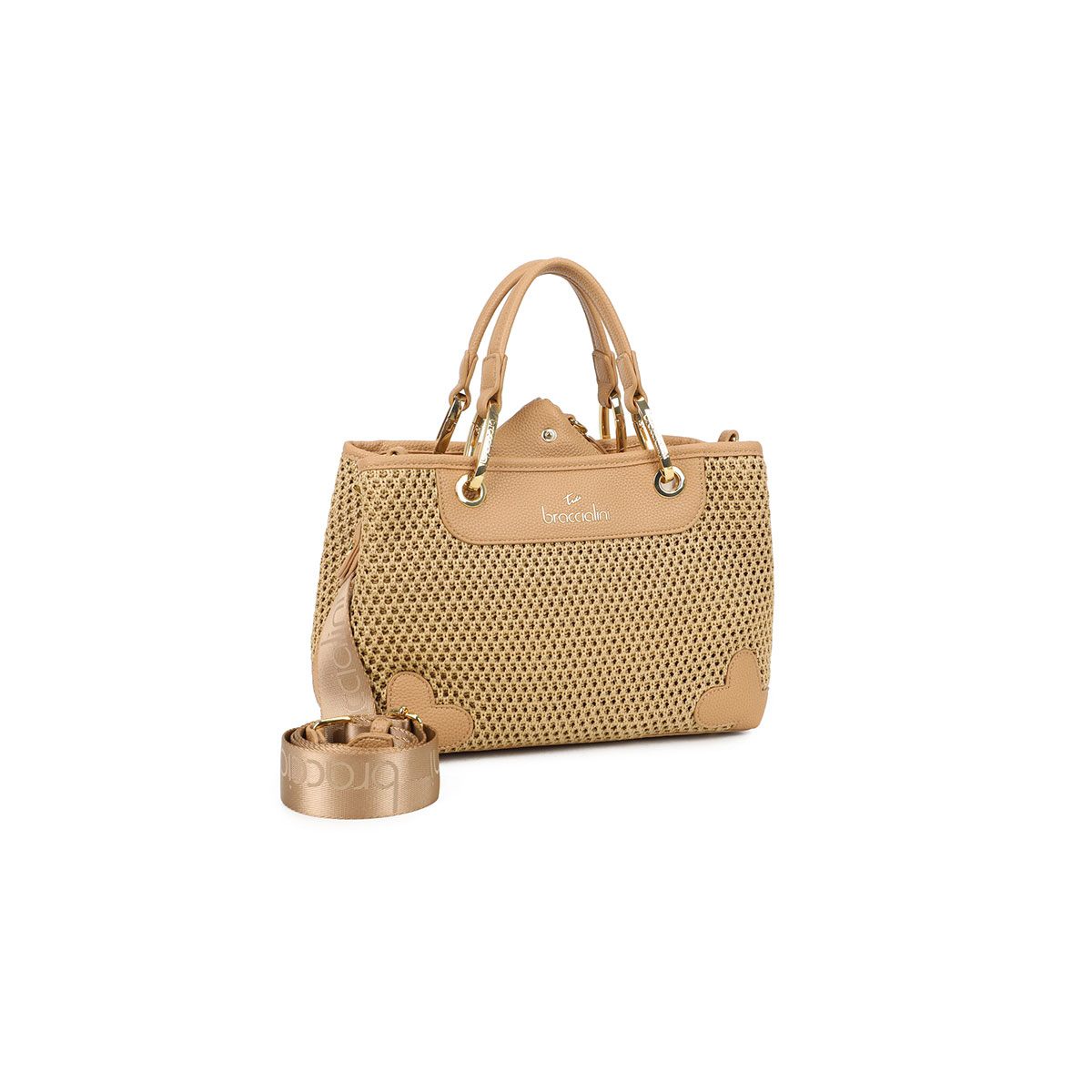 Mittelgroße Handtasche aus Tricot-Gewebe in Stroh-Optik in Biscotto, mit Doppelgriffen und Kunstleder-Details. Der abnehmbare und verstellbare Schulterriemen ermöglicht zwei Tragevarianten – in der Hand oder über der Schulter – und passt sich jedem Moment des Tages an. Innen befindet sich eine herausnehmbare Pochette mit Reißverschluss, die bei Bedarf als zweite Tasche genutzt werden kann.