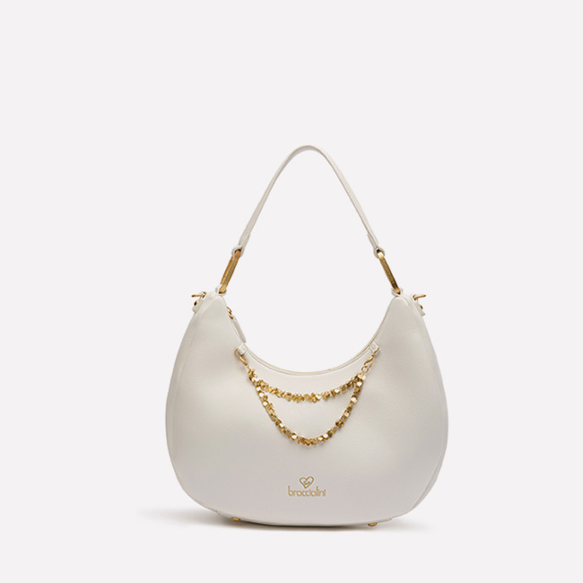 Beigefarbene Schultertasche aus Leder mit weichen, raffinierten Linien. Das goldfarbene Schmuckherz mit doppeltem Herzchen-Detail und dekorativer Torsade verleiht einem Modell mit starker Persönlichkeit eine romantische Note. Mit verstellbarem und abnehmbarem Schulterriemen ausgestattet, begleitet sie dich stilvoll zu jeder Gelegenheit.