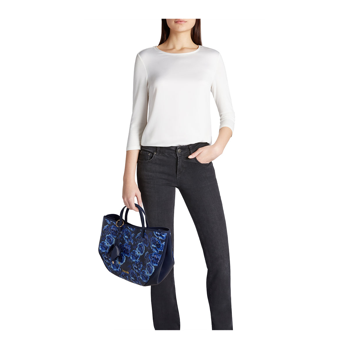 Eine Harmonie aus Formen und Farben prägt diese große Handtasche, in der die Eleganz der Doppelhenkel auf eine raffinierte Blüte in Blautönen trifft. Das klare, strukturierte Design findet seinen kreativen Akzent im Ledercharm: ein Blumenpaar, das direkt aus dem Henkel zu sprießen scheint und dreidimensionale Bewegung sowie einen Hauch Couture-Handwerkskunst verleiht – für ein Accessoire, das sich mit Anmut abhebt.