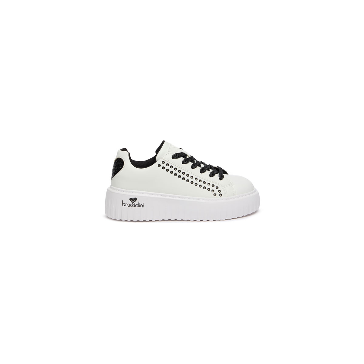 Bequeme Sneakers mit Ledersohle, weiße Unifarb-Basis mit schwarzen Details; glänzende schwarze Nieten verzieren den Schuh, dazu Schnürsenkel aus schwarzem und silbernem Lurexgarn. Weiße Plateau-Gummisohle mit seitlichem Logodetail. |