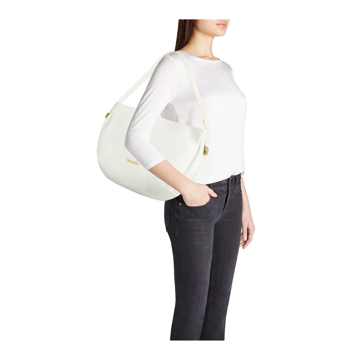 Hobo-Tasche aus weichem Kalbsleder mit Dollaro-Prägung in Weiß, gestaltet in einem schlichten und modernen Design. Die abgerundeten Linien und das klare Profil machen sie zu einer vielseitigen Wahl – ideal, um Alltagslooks mit zurückhaltender Eleganz zu ergänzen. Leicht und geräumig verfügt sie über einen breiten Henkel für ein bequemes Tragen über der Schulter. Das goldfarbene Braccialini-Logo setzt einen edlen, unverwechselbaren Akzent. Ein Modell für alle, die Funktionalität suchen, ohne auf Stil zu verzichten.
