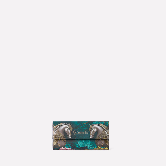 Handtasche aus feinem Kalbsleder mit einem Druck, der eine traumhafte Vision darstellt, in der zwei elegante und energiegeladene Pferde die Hauptrolle spielen. Der Druck, der mit Hochfrequenztechnik erzielt wurde, macht die Bilder fast dreidimensional, während metallische Akzente hier und da im Licht hervorstechen. Abnehmbarer und verstellbarer Schulterriemen.