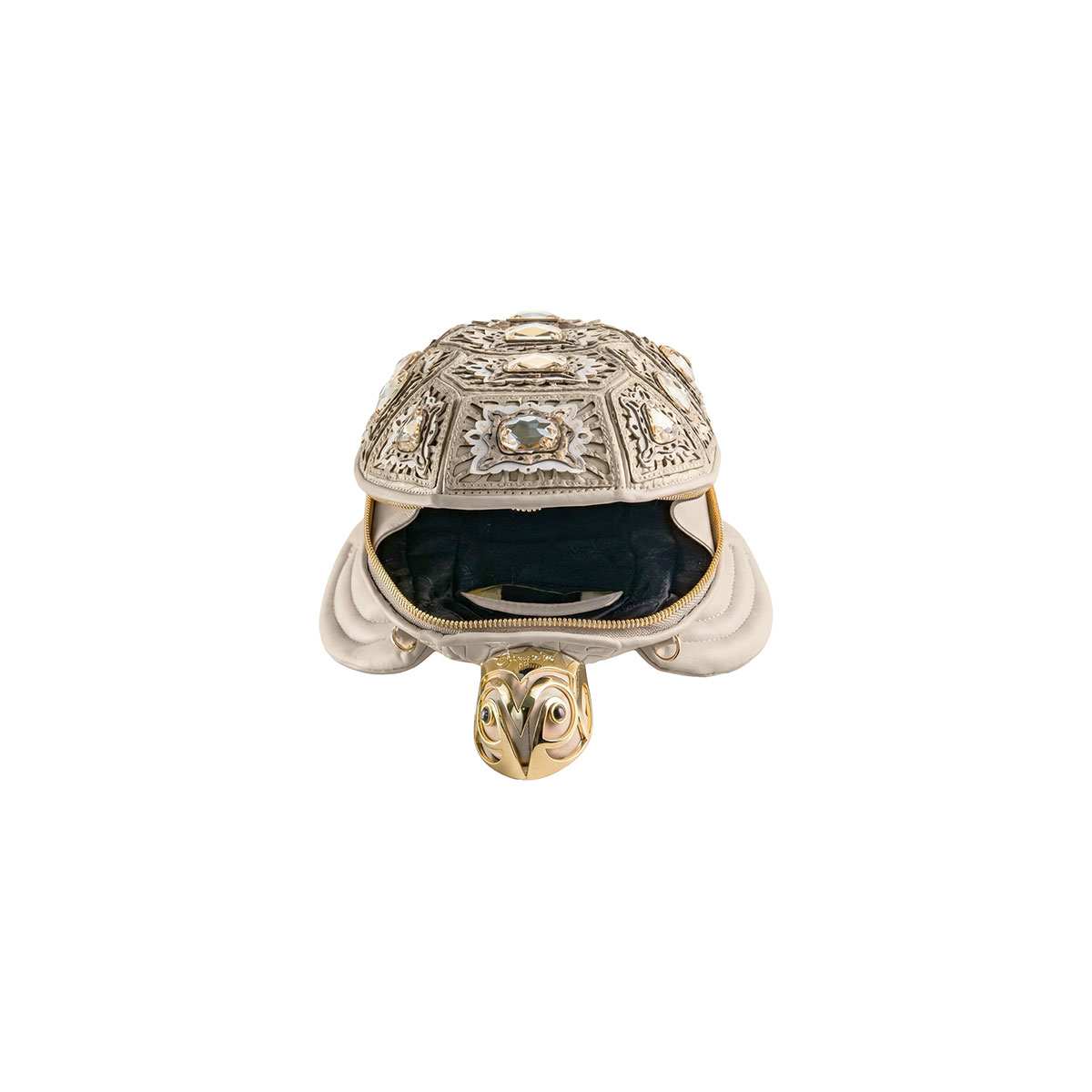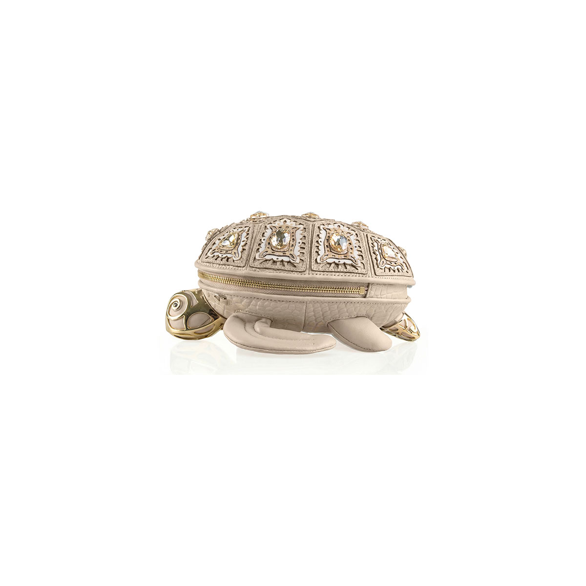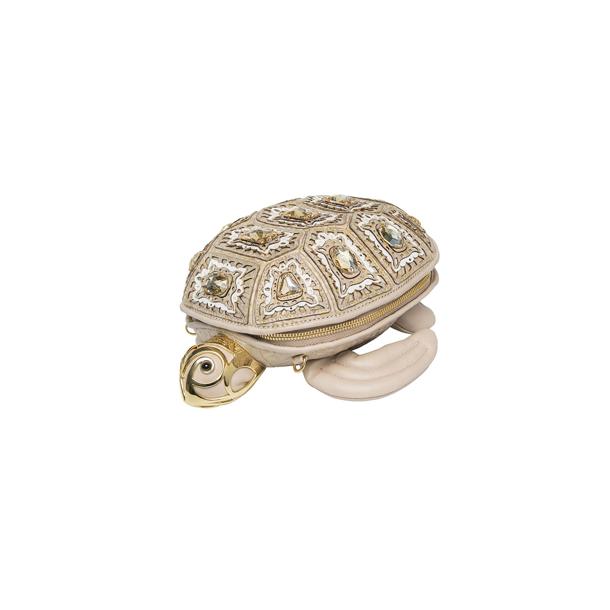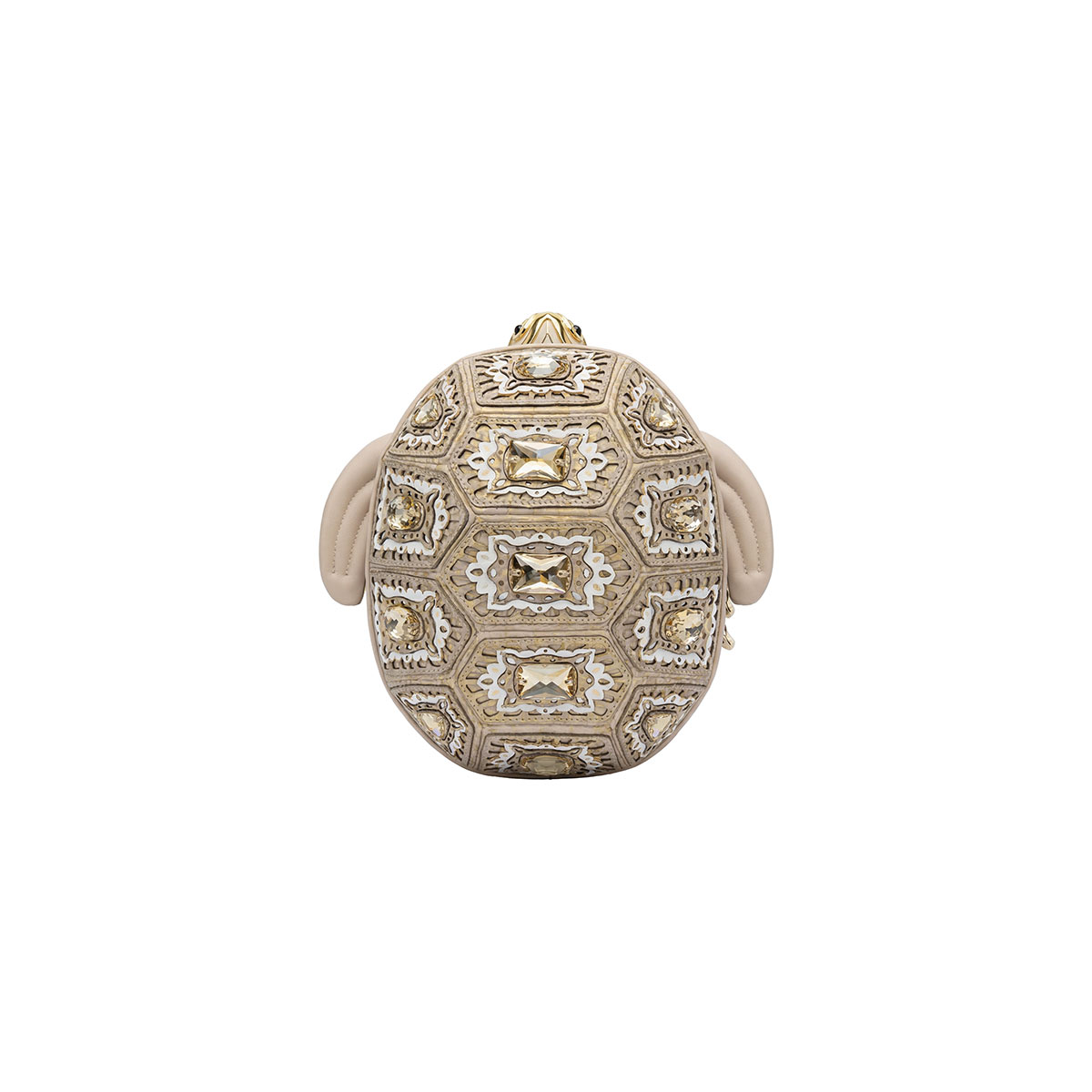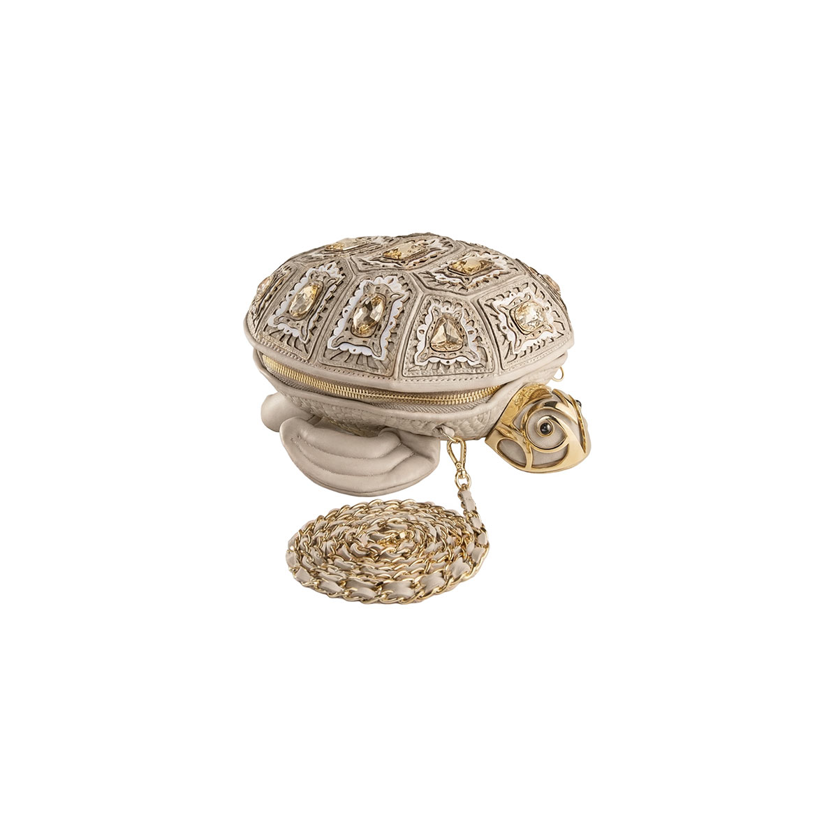Bezaubernd und überraschend – diese Tasche in Form einer Meeresschildkröte ist ein kleines Meisterwerk an Handwerkskunst und Fantasie. Aus Leder mit Laserschnitt gefertigt, um den dreidimensionalen Effekt des Panzers zu reproduzieren, wird sie durch feine, von Hand auf jede Schuppe aufgebrachte Steine veredelt, die die realistischen Details betonen. Der praktische Reißverschluss verläuft über den gesamten Umfang der Tasche und garantiert Funktionalität, ohne auf Stil zu verzichten. Der goldfarbene Kettenriemen ermöglicht bequemes Tragen über der Schulter – ein einzigartiges Accessoire, das Ironie und Raffinesse vereint.