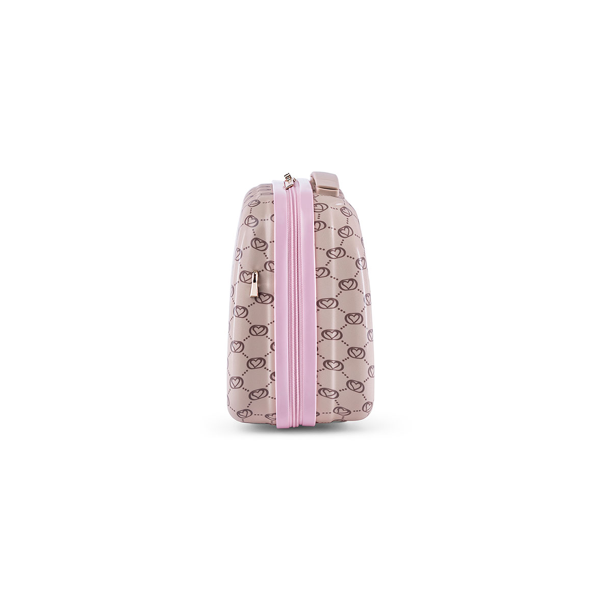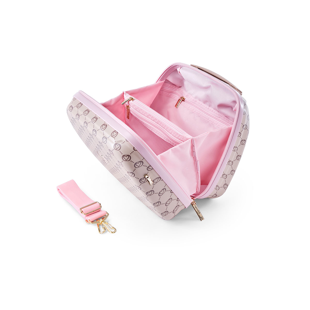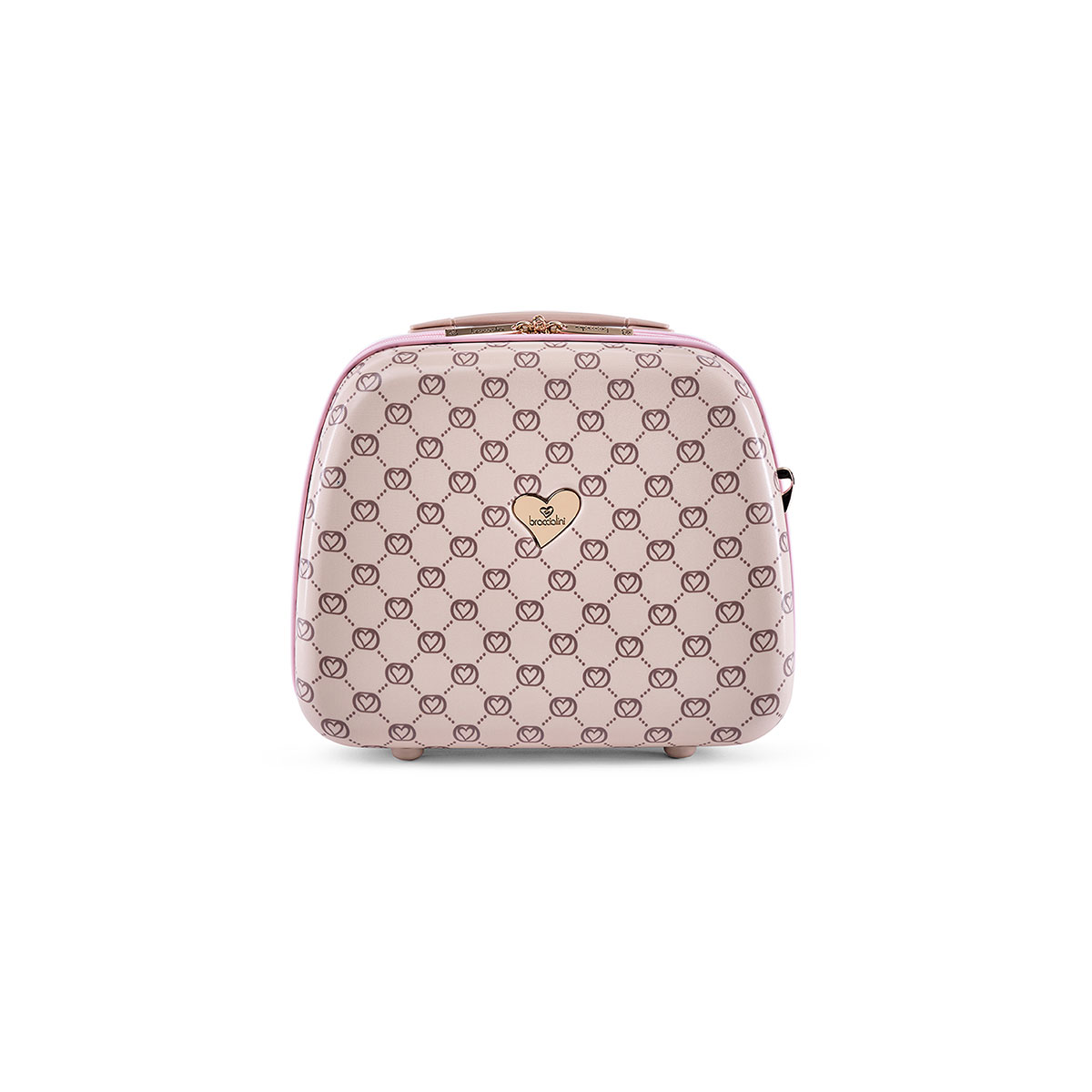 Kompakt, raffiniert und unglaublich praktisch — der Braccialini Monogram Beauty Case vereint zarte Rosatöne und goldene Details zu einem sophistizierten, femininen Look. Das Braccialini-Herzchen, das unverwechselbare Symbol der Marke, wird zum Protagonisten eines eleganten Allover-Druckmusters, das die gesamte Oberfläche ziert und die ikonische Identität der Kollektion unterstreicht. Aus robustem Hartmaterial gefertigt, verfügt er über einen Doppelreißverschluss für Sicherheit und Komfort. Das übersichtliche Innenfach ermöglicht ein ordentliches Verstauen von Kosmetik und Accessoires — perfekt für jede Reise. Komplett mit einem rosa Gummi-Kofferanhänger und einem Schutzbeutel, ideal als Ergänzung zu den koordinierten Trolleys.
