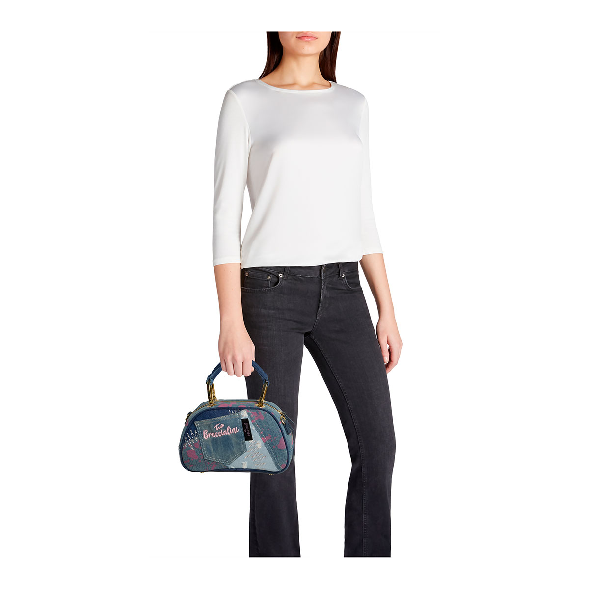 Kleine Bowlingtasche aus Jeansstoff mit lebendigem und originellem Look, veredelt durch ein kreatives Patch mit Used-Effekt, dekorative Stickereien und einen Sprenkel-Farbprint. Abgerundet wird das Modell durch eine aufgesetzte Tasche im klassischen Five-Pocket-Stil mit kontrastierendem, rosa gesticktem Braccialini-Logo. Ausgestattet mit Doppelhenkeln und einem abnehmbaren sowie verstellbaren Schulterriemen aus Stoff für zwei Tragevarianten. Ein dynamisches und ausdrucksstarkes Accessoire, perfekt für alle, die ihren Stil selbstbewusst unterstreichen möchten.