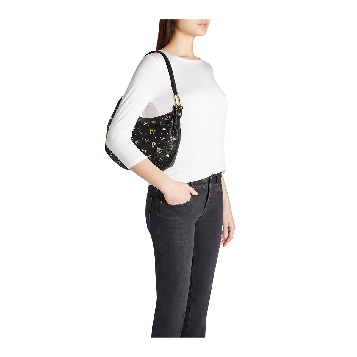 Schultertasche in Schwarz mit einem einzelnen Henkel sowie einem abnehmbaren, verstellbaren Schulterriemen für zwei Tragemöglichkeiten. Das Design wird durch eine Fülle goldener Nieten veredelt, die Herzen, Schmetterlinge, Heißluftballons und Wolken darstellen und die gesamte Oberfläche schmücken – für einen funkelnden Look voller Persönlichkeit.