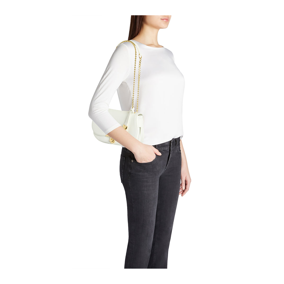 Schultertasche aus weichem Leder in Weiß mit langgezogenen und puristischen Design. Ausgestattet mit einer Klappe mit goldfarbenem Drehverschluss und eingraviertem Logo, verfügt sie über einen verstellbaren Schulterriemen und kann auch als Crossbody getragen werden, was ihr eine doppelte Persönlichkeit verleiht. Ein edler Lederanhänger mit herzförmigen Metalldetails in Goldoptik sorgt für eine romantische und unverwechselbare Note. Die klaren Linien und der helle Farbton machen sie zu einem vielseitigen Accessoire, ideal zur eleganten Ergänzung von Alltagslooks.