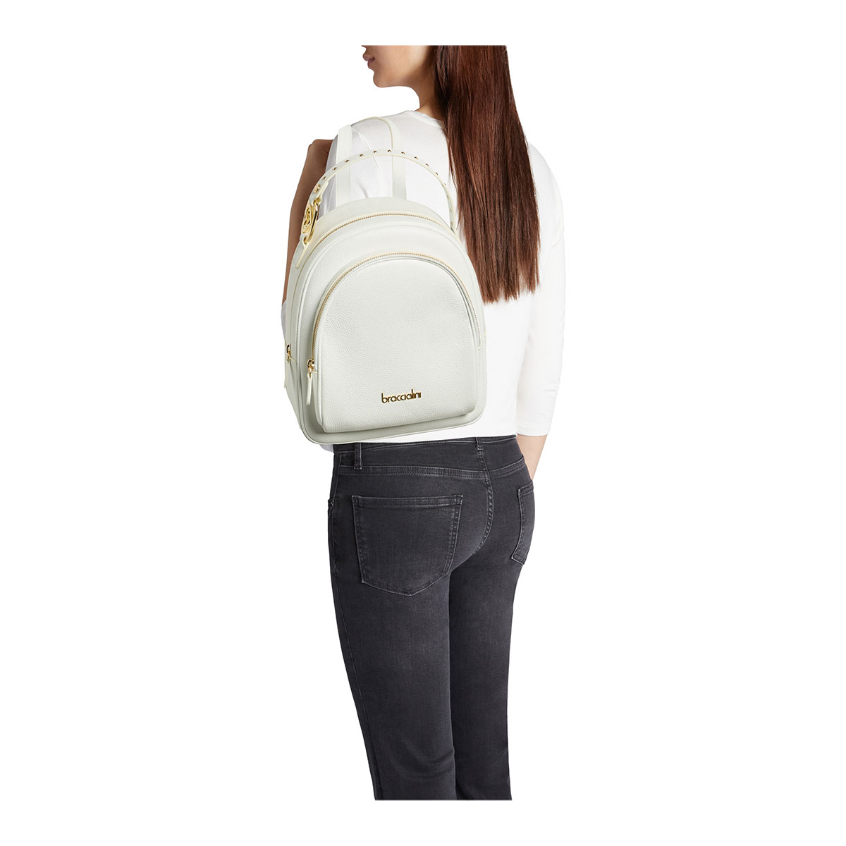 Backpack in soft white leather with an essential and refined design. Adjustable shoulder straps and a top handle ensure ease of everyday use, offering practicality without sacrificing elegance. The handle is embellished with an elegant gold-tone metal heart-shaped detail, adding a sophisticated and contemporary touch to the model. Ideal for those seeking an understated style with carefully curated details.