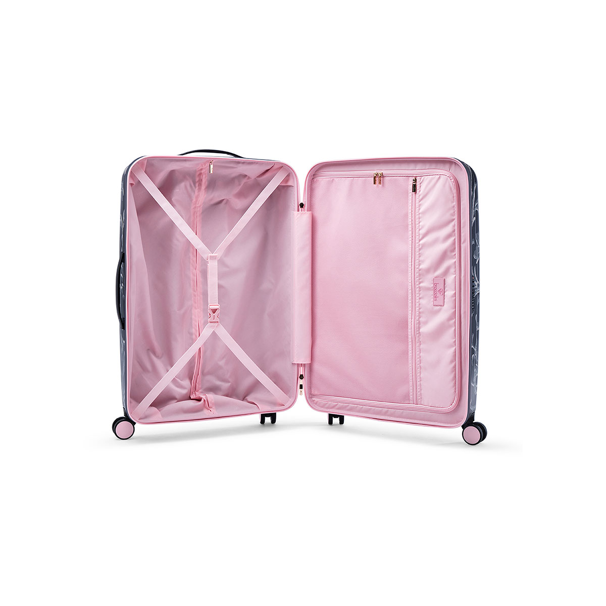 Featuring a flat TSA combination lock with an expandable zip to increase volume, it comes with an adjustable telescopic handle and four 360° multidirectional spinner wheels for smooth, effortless travel. The well-organised interior with double divider and clothing straps keeps everything in order throughout your journey. The set is completed by a coordinated luggage tag and a dust bag.