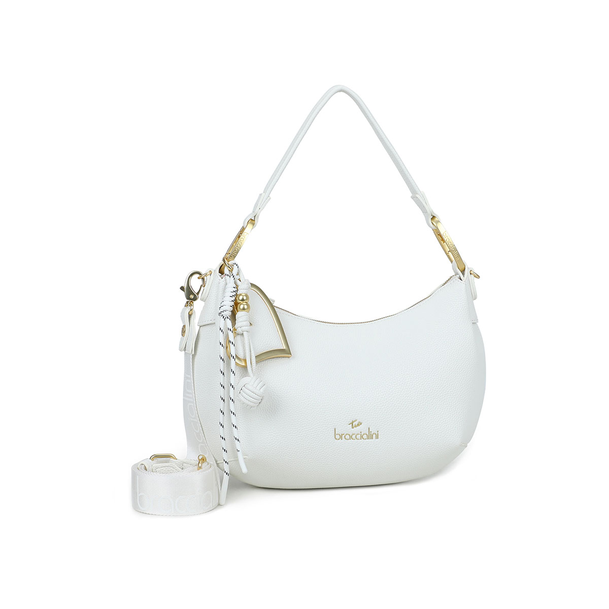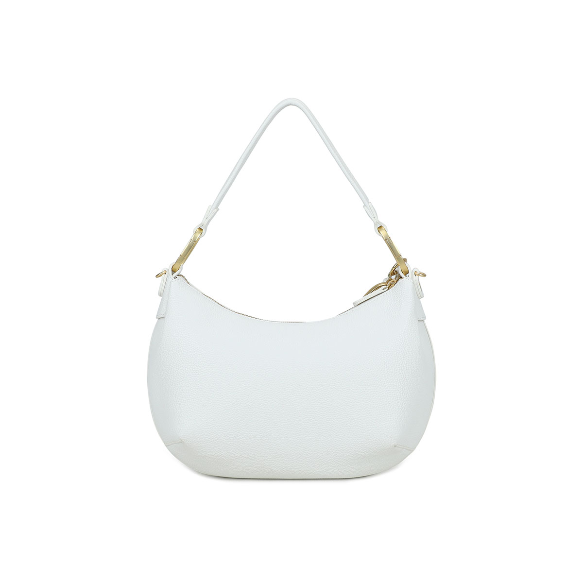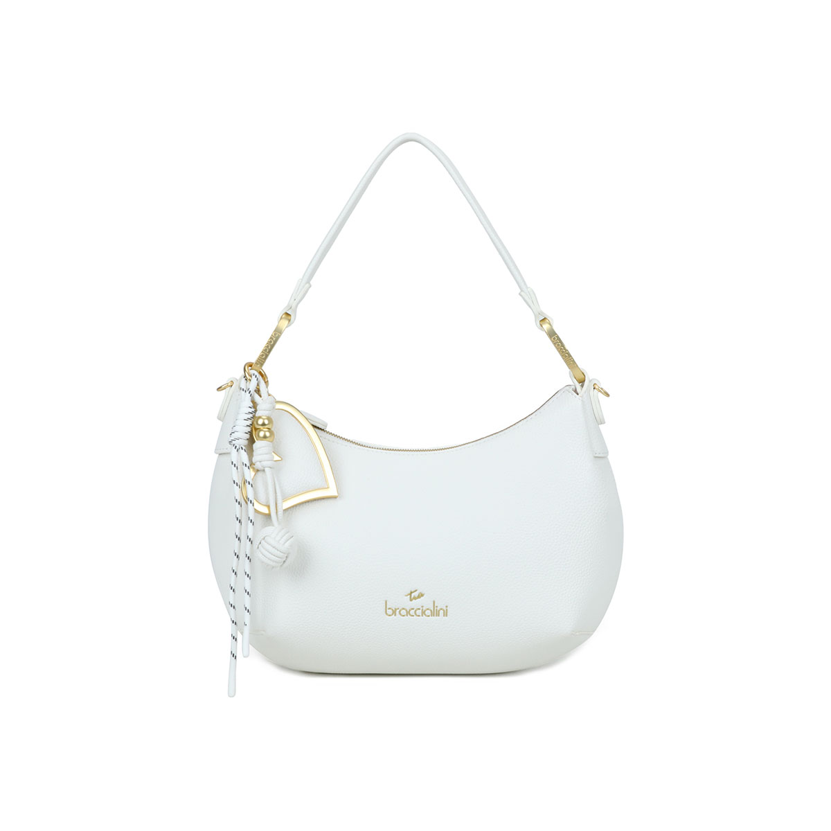 Hammered faux-leather shoulder bag with a half-moon design and a soft silhouette. The removable multi-strand maxi charm with a satin-finish gold metal heart, coordinated with the bag, adds an iconic touch. Comfortable to wear thanks to the single handle and the included branded shoulder strap, adjustable and detachable, it’s designed to accompany you every day with practicality and elegance.