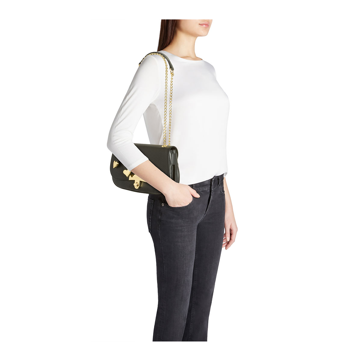 Shoulder bag in soft black leather with an elongated and minimalist design. Featuring a flap with a gold-tone turn-lock closure engraved with the logo, it is equipped with an adjustable shoulder strap and can also be worn crossbody, offering dual styling options. A refined leather charm with gold-tone metal heart-shaped details adds a romantic and distinctive touch. Clean lines and the neutral shade make it a versatile accessory, perfect for elegantly completing everyday looks.