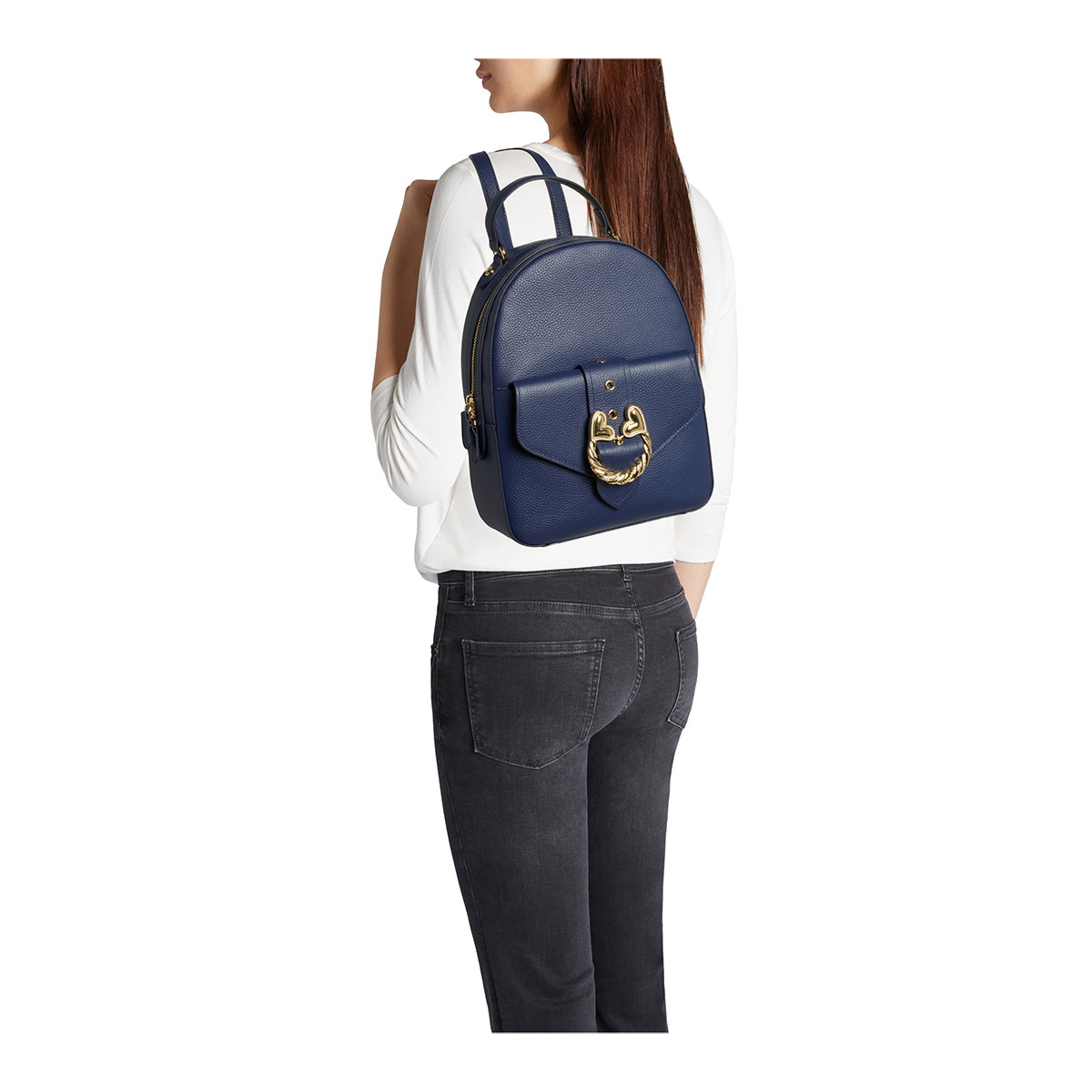 Semi-structured blue leather backpack with a feminine design. The gold-tone jeweled twisted-cord accessory with hearts takes center stage, adding a romantic, statement touch. Comfortable yet refined, it features adjustable shoulder straps and a top handle.