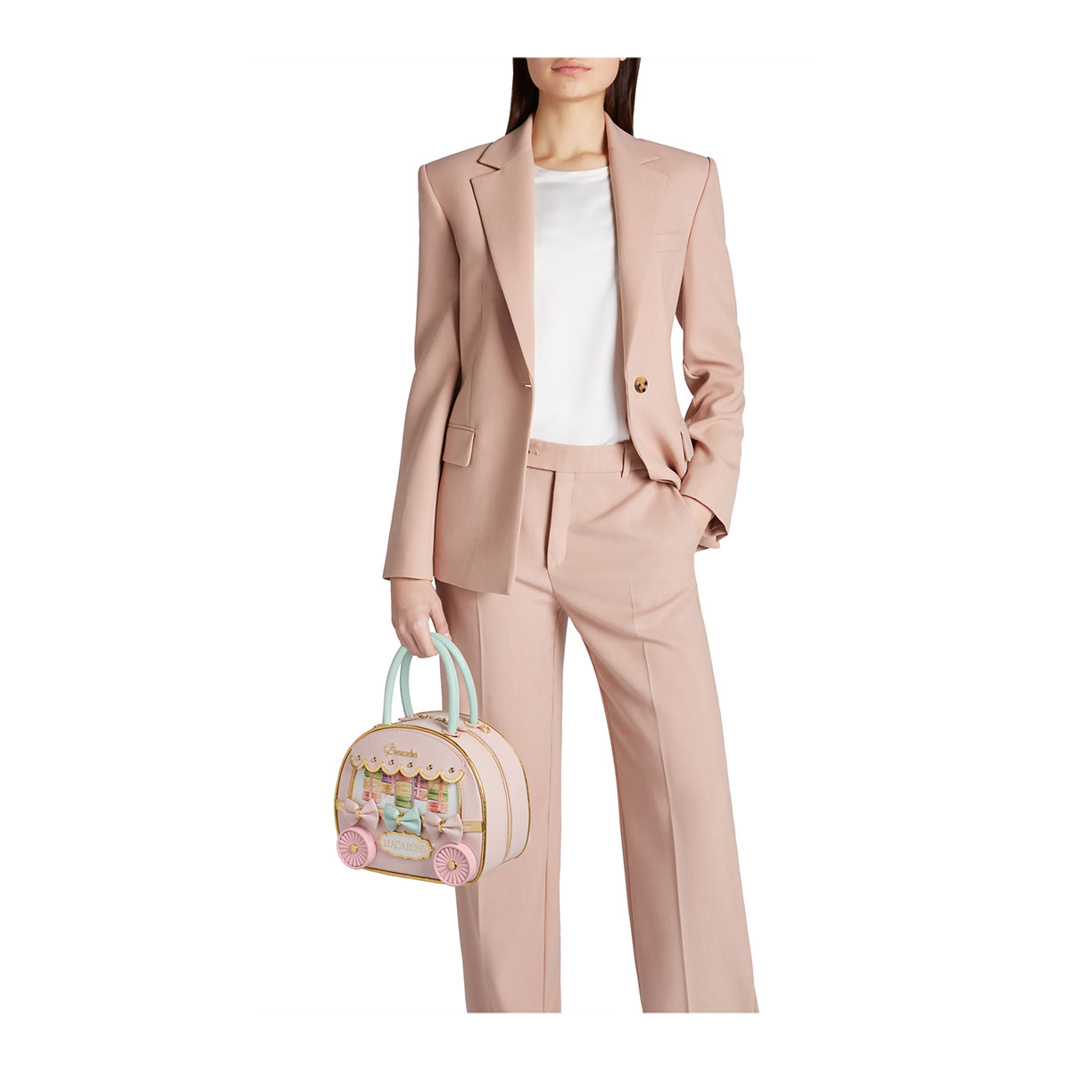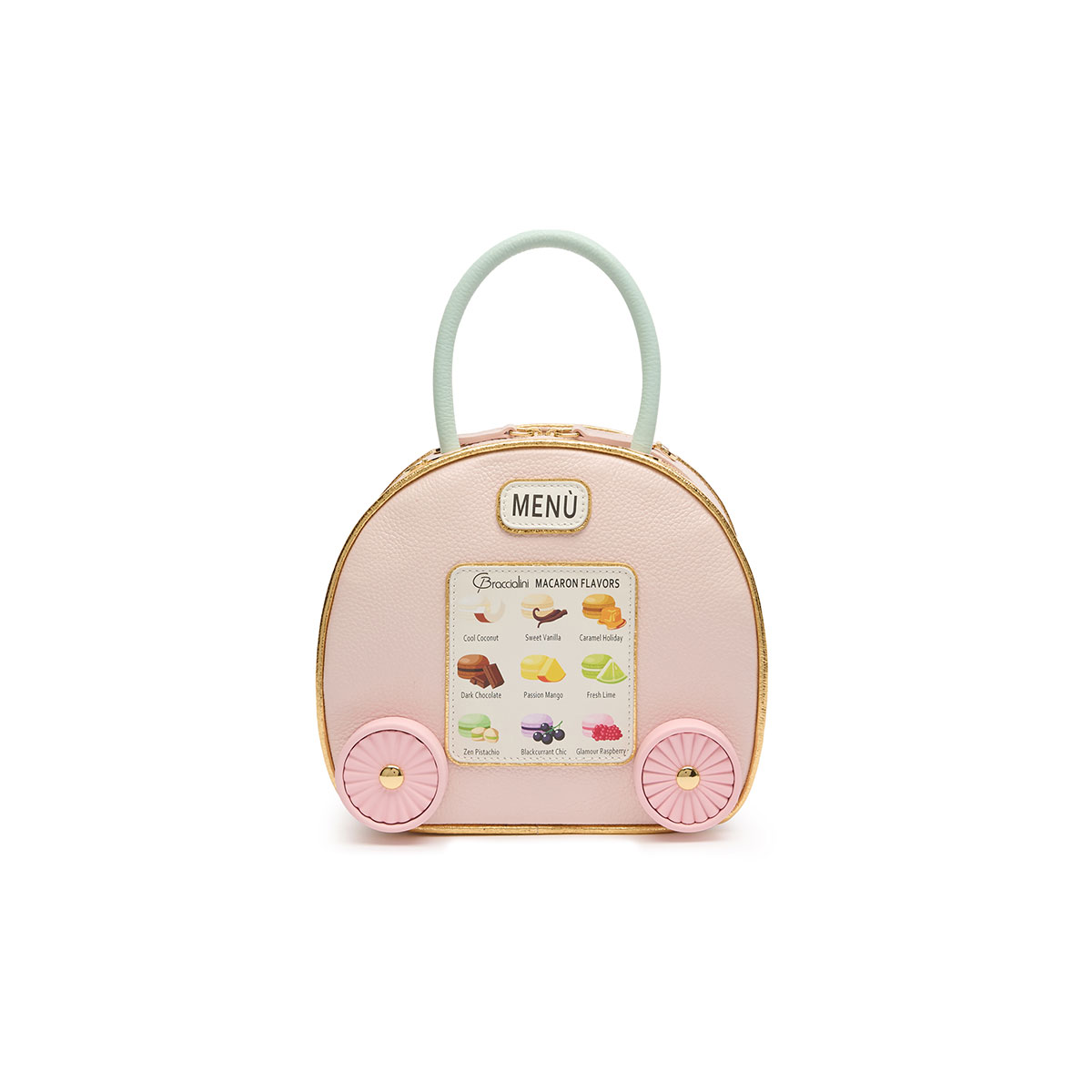 An irresistible top-handle bag inspired by a romantic sweet carriage. Crafted in delicate pastel shades of pink and light blue, it combines creativity and refinement in a unique and playful design. Soft bows blend harmoniously with the decorative curtain featuring golden details and raised wheels. On the back, a fun menu lists delicious macaron flavors, adding a whimsical and dreamy touch. Rigid double handles and a gold chain shoulder strap allow for versatile styling, making it a show-stopping yet functional accessory.