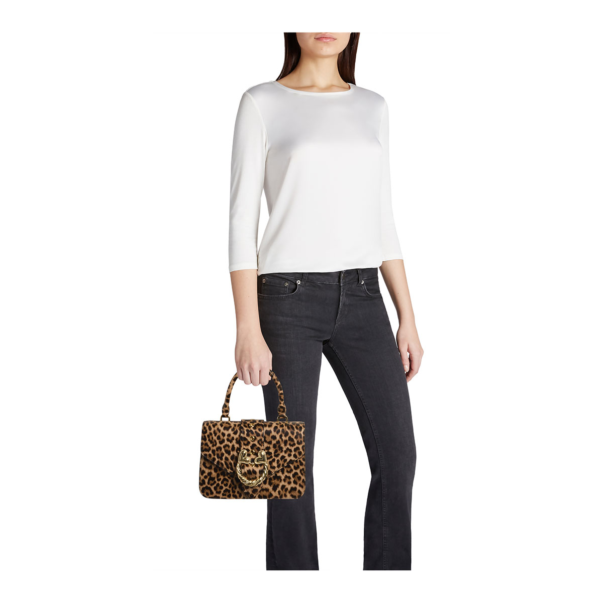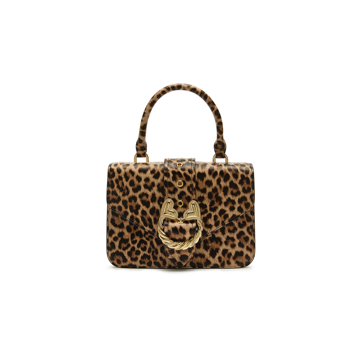 Medium leather handbag with leopard print, featuring a compact, clean silhouette, elevated by an elegant jeweled closure: a gold-tone twisted cord with crystals and double hearts, the signature of the Baroque line. The single handle and the detachable, adjustable shoulder strap offer two ways to wear it—perfect for those who seek style and romance in every detail.