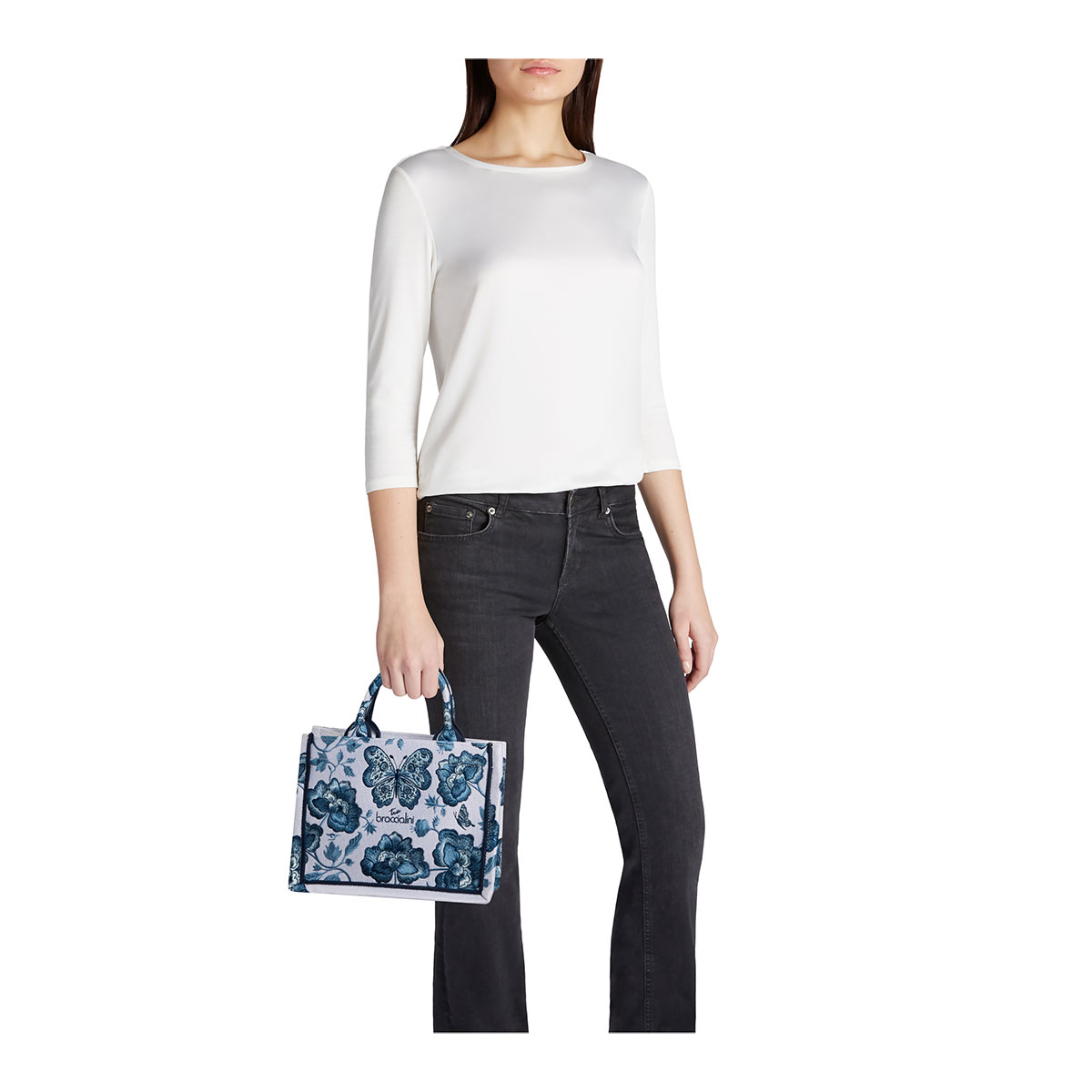 Small to medium-sized handbag with double handles. Crafted from structured fabric, it is embellished with refined floral and butterfly embroidery in tone-on-tone blue threads, creating a decorative, high-impact three-dimensional effect. The design is completed by an inner pouch and a removable, adjustable shoulder strap that allows for versatile carrying options, by hand or over the shoulder.