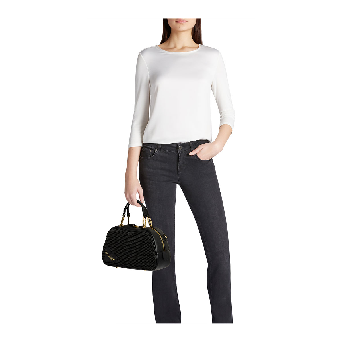 Black bowling bag with double handles, featuring a removable and adjustable logoed shoulder strap for versatile wear. The design is enhanced by an original woven straw insert that adds a fresh, summery and natural touch, creating a refined contrast with the tone-on-tone dollar-grain effect trims. The heart-shaped detail with Braccialini logo applied on the front completes the look with elegance. A fresh and contemporary style, perfect for adding a distinctive touch to your everyday outfits.