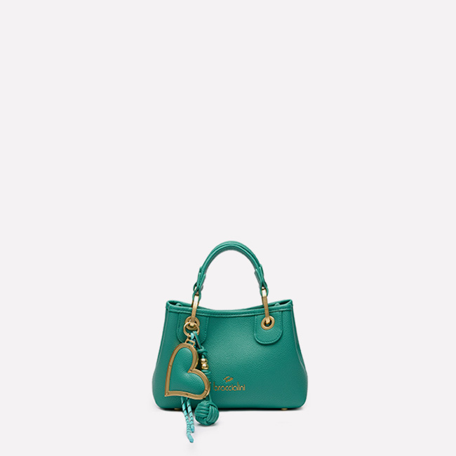 Small gold leather handbag with a compact, clean silhouette, elevated by an elegant jeweled closure: a gold-tone twisted cord with crystals and double hearts, the signature of the Baroque line. The single handle and the detachable, adjustable shoulder strap offer two ways to wear it—perfect for those who seek style and romance in every detail.