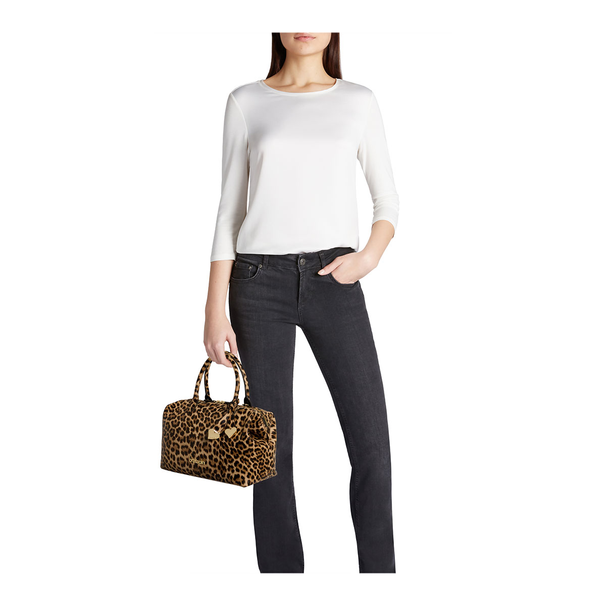 Bowling bag in leather with leopard print, featuring double handles and a removable, adjustable shoulder strap for dual carrying options. Equipped with a double gold-tone metal zip closure, it boasts a clean and structured design, ideal for everyday use. An essential and refined model, perfect for those seeking practicality without sacrificing elegance. The look is completed by a leather charm with gold-tone metal heart-shaped details, adding a romantic and distinctive touch.