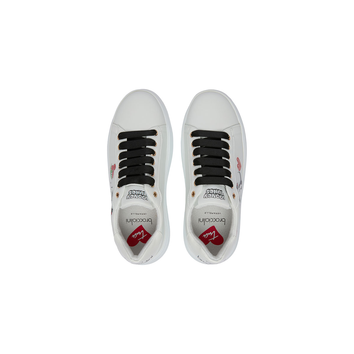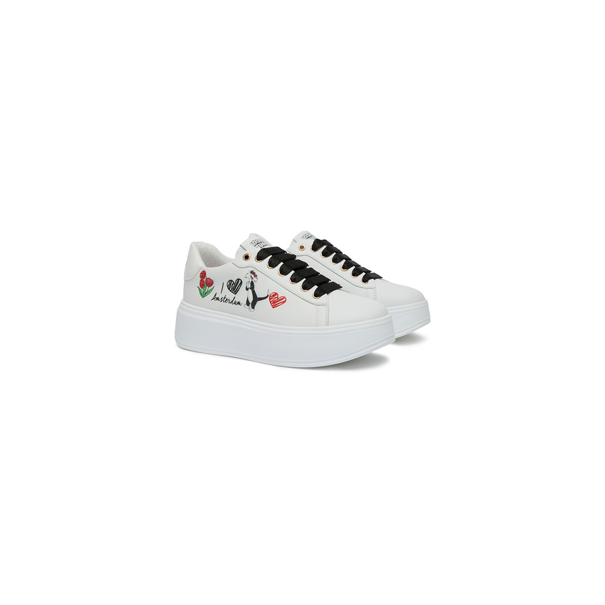 White sneakers with a lively, witty look, decorated with the funny Sylvester, red tulips, and colorful hearts, paying homage to the city of Amsterdam. Black laces and the “Looney Tunes” logo on the tongue add a bold edge to this model.