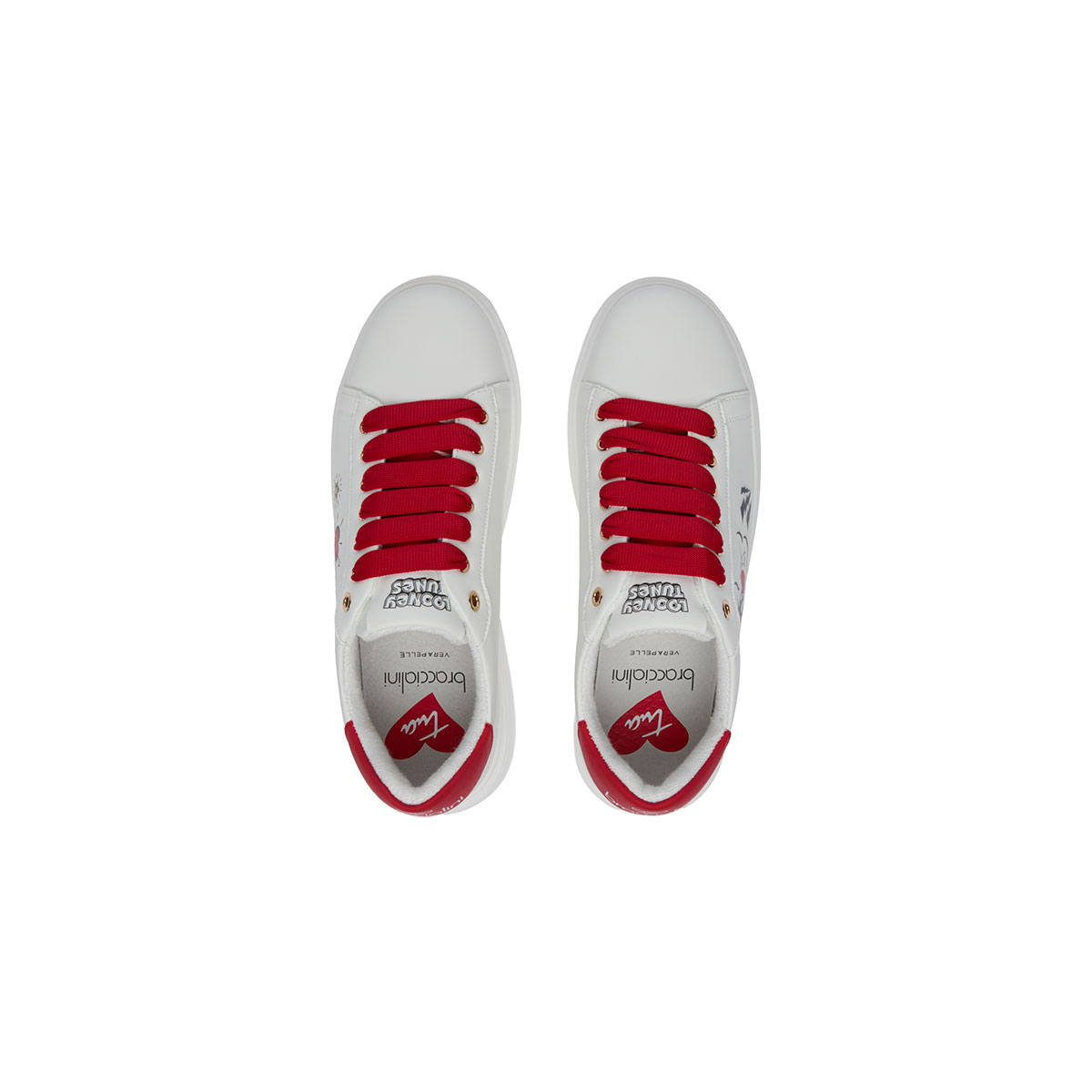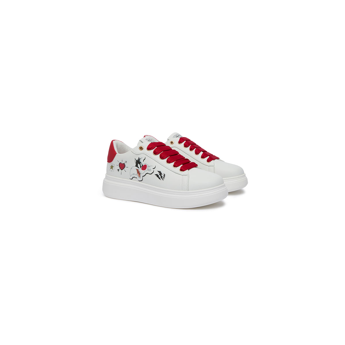 White sneakers with an energetic, playful design, decorated with a print of Sylvester, hearts, stars, and lightning bolts. Contrasting red details give this model a daring touch.