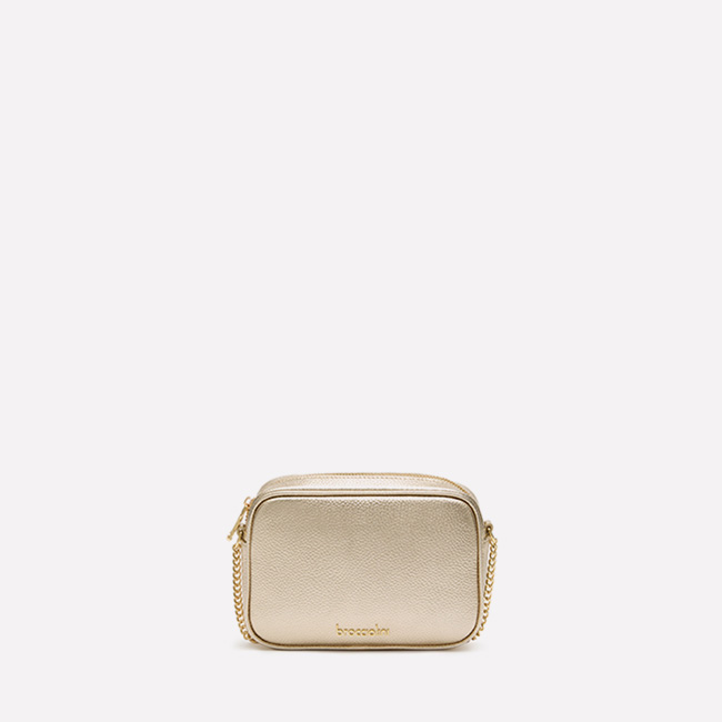 Large flat gold leather pouch with a clean, timeless design. It is finished with a practical gold-tone zip closure and a side strap, and embellished with the Braccialini logo applied on a gold-tone front plaque. Compact yet roomy, it’s ideal for keeping everyday essentials stylishly organized—either inside a larger bag or carried by hand. A practical and refined accessory, perfect for adding elegance to every moment of the day.