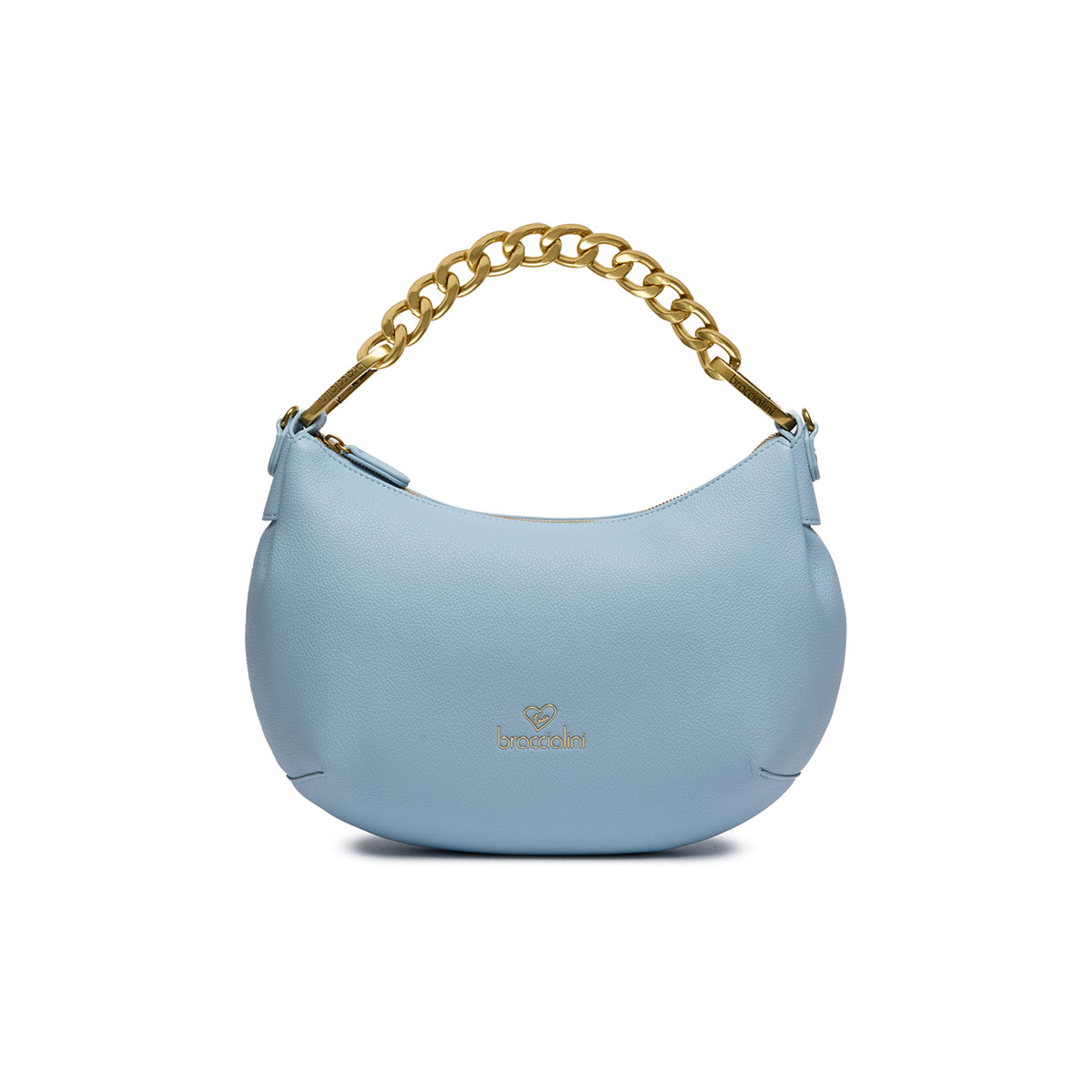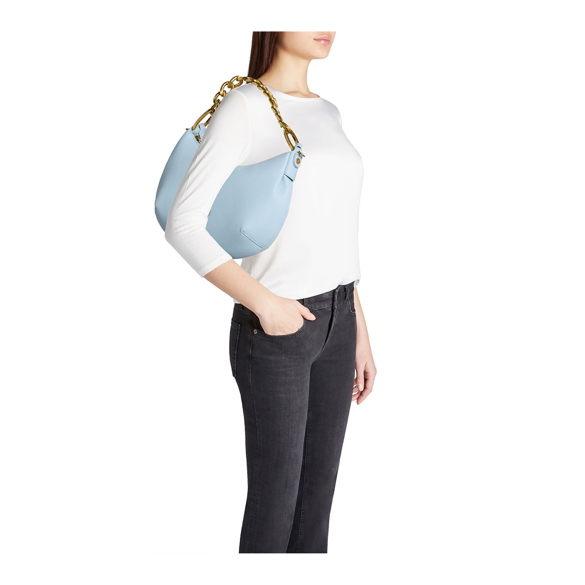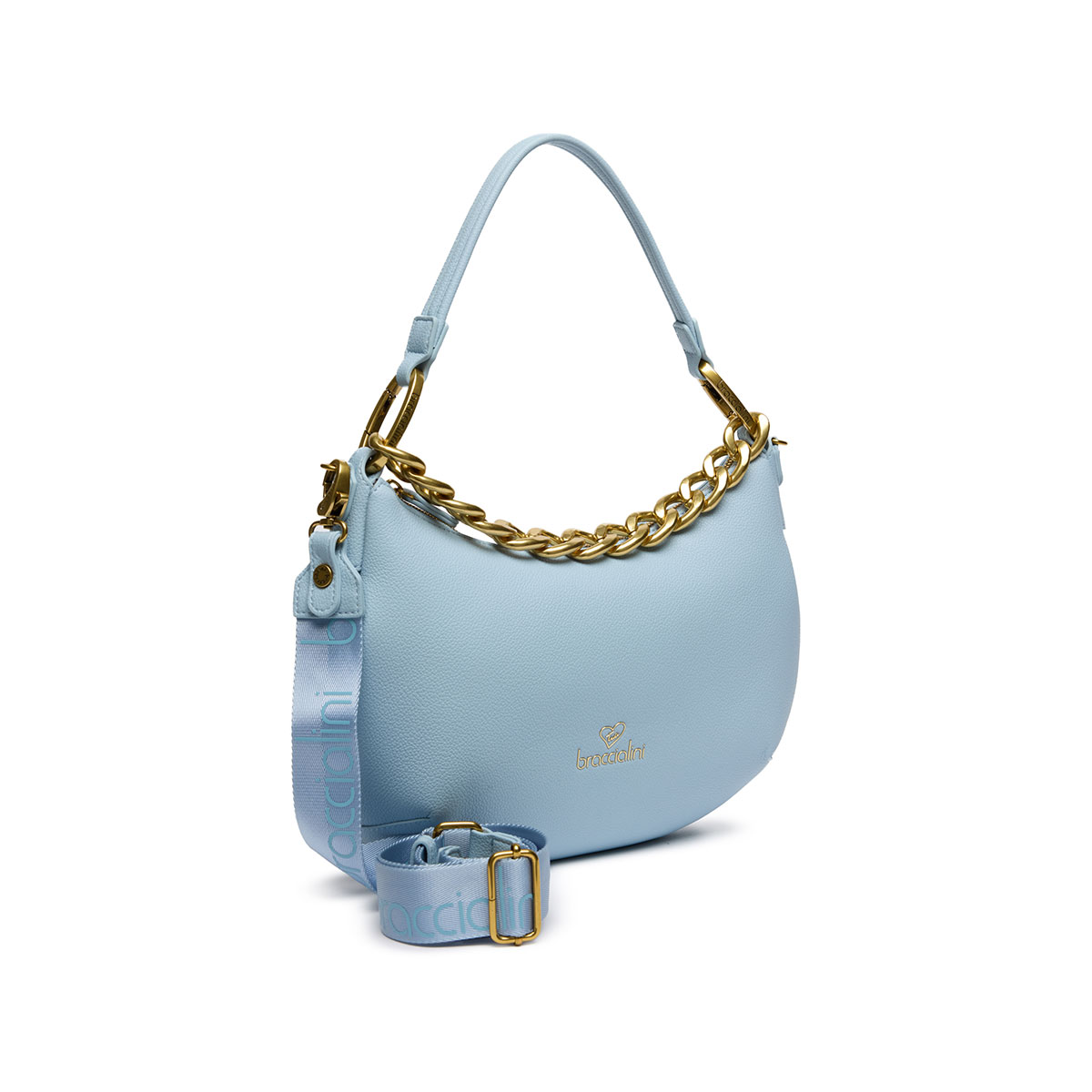 Light blue hobo bag with single handle and a detachable, adjustable logoed shoulder strap for dual carrying options. Inside, a removable pouch that can be used as a second bag. The design is enhanced by a removable golden chain with oversized links, adding a glamorous and distinctive touch. |