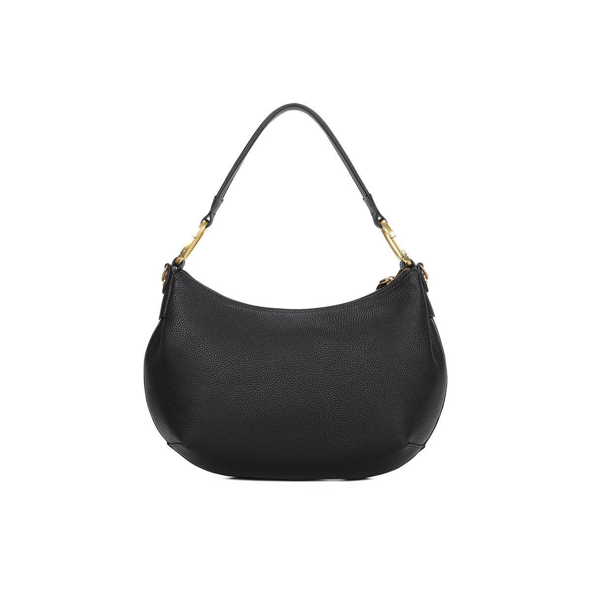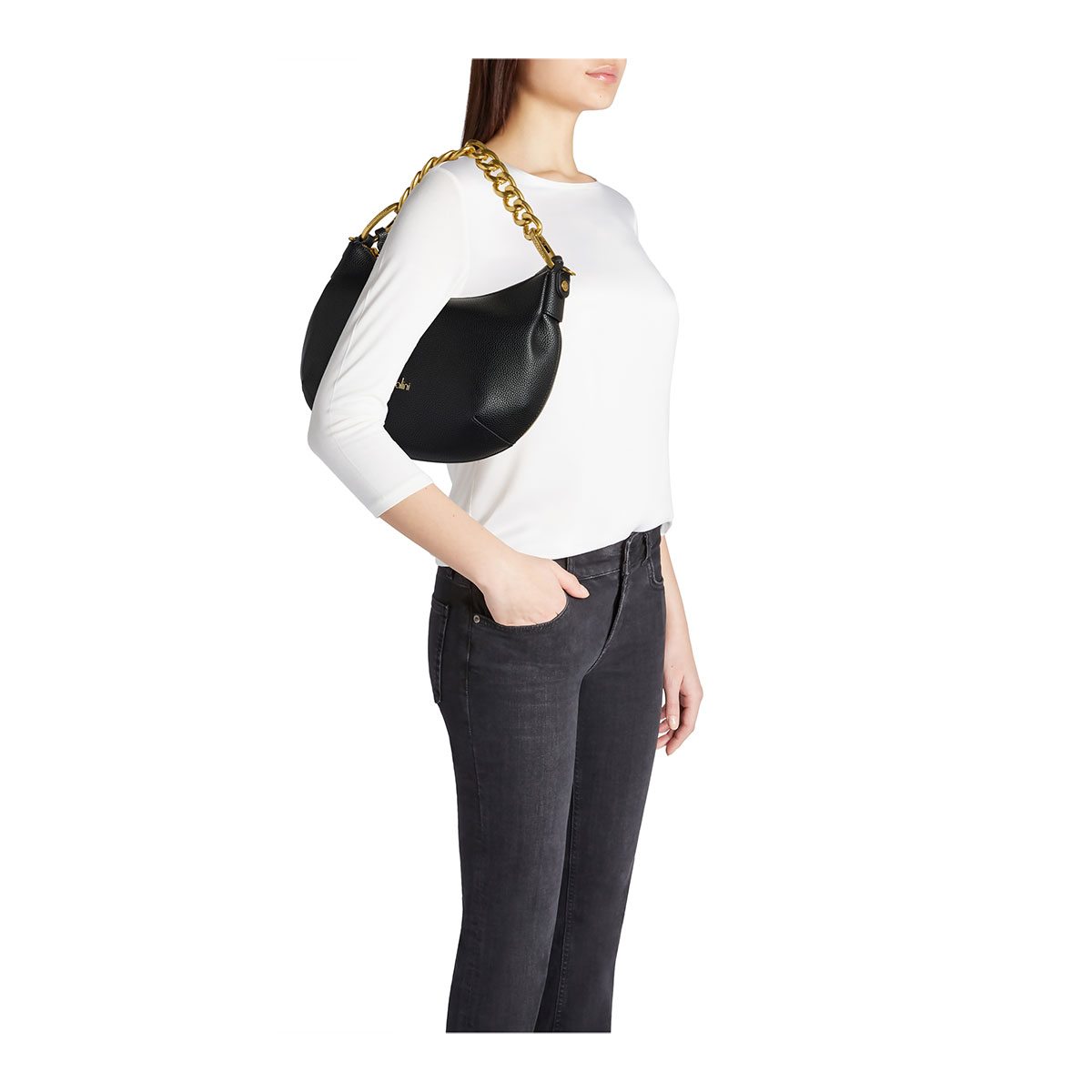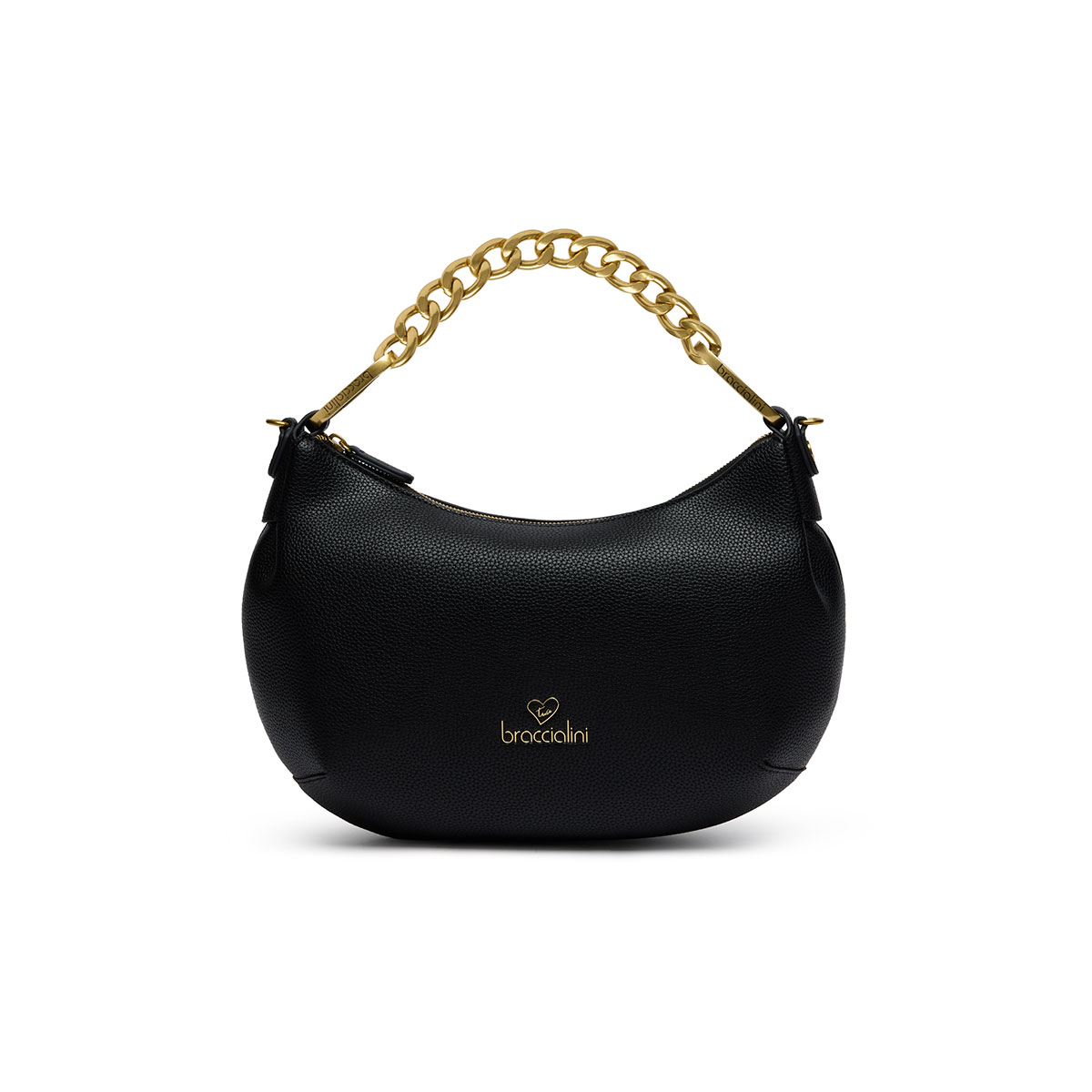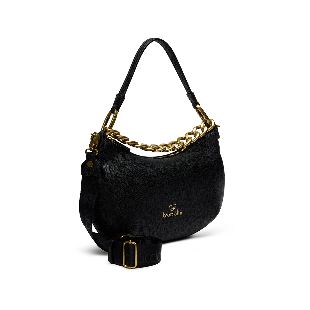 Black hobo bag with single handle and a detachable, adjustable logoed shoulder strap for dual carrying options. Inside, a removable pouch that can be used as a second bag. The design is enhanced by a removable golden chain with oversized links, adding a glamorous and distinctive touch. |