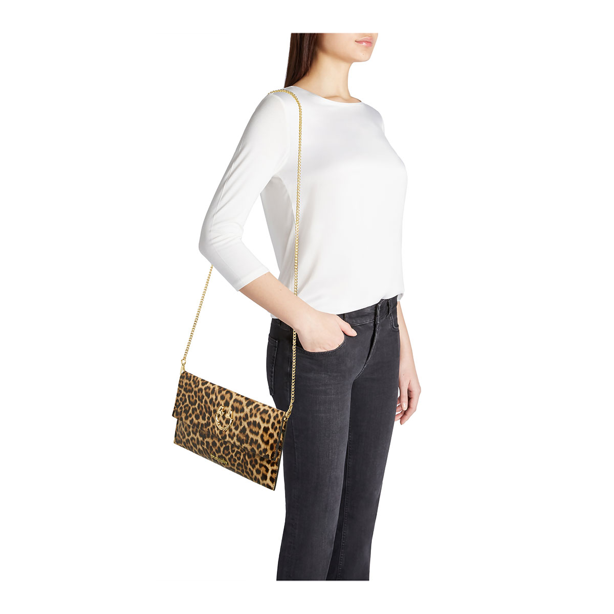 Envelope-style leather crossbody bag with leopard print and clip closure. With a detachable shoulder strap and a lined interior, it discreetly holds small everyday essentials. The flap is embellished with a gold heart-shaped jeweled detail with decorative accents, adding a romantic, precious touch. Easy to carry and refined to wear, it’s the perfect ally for daily use or special occasions.