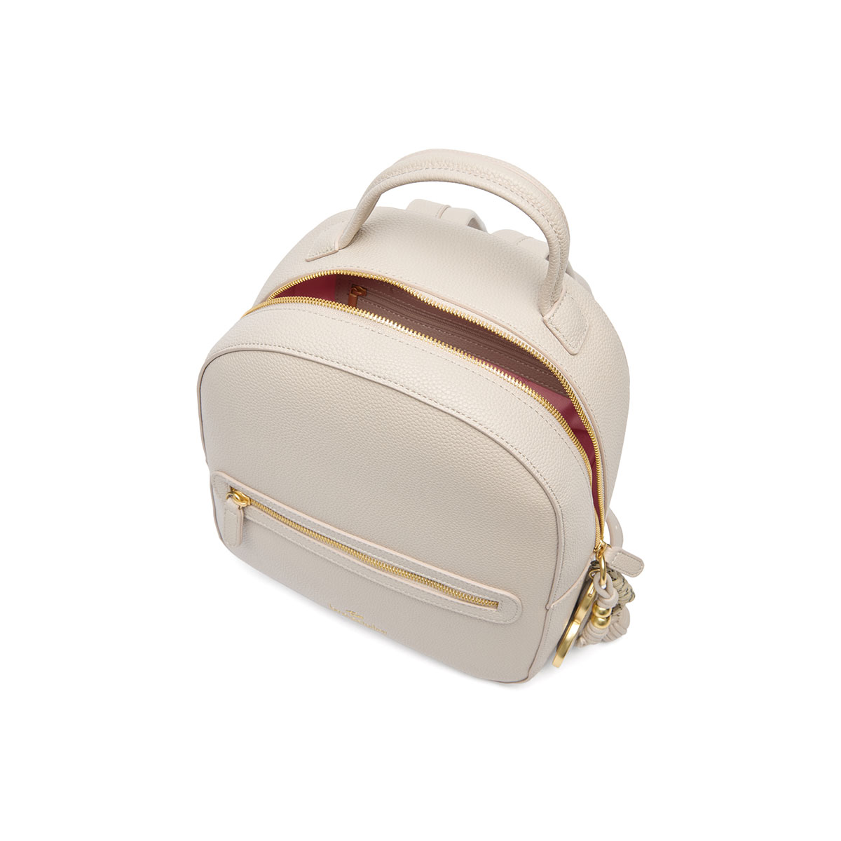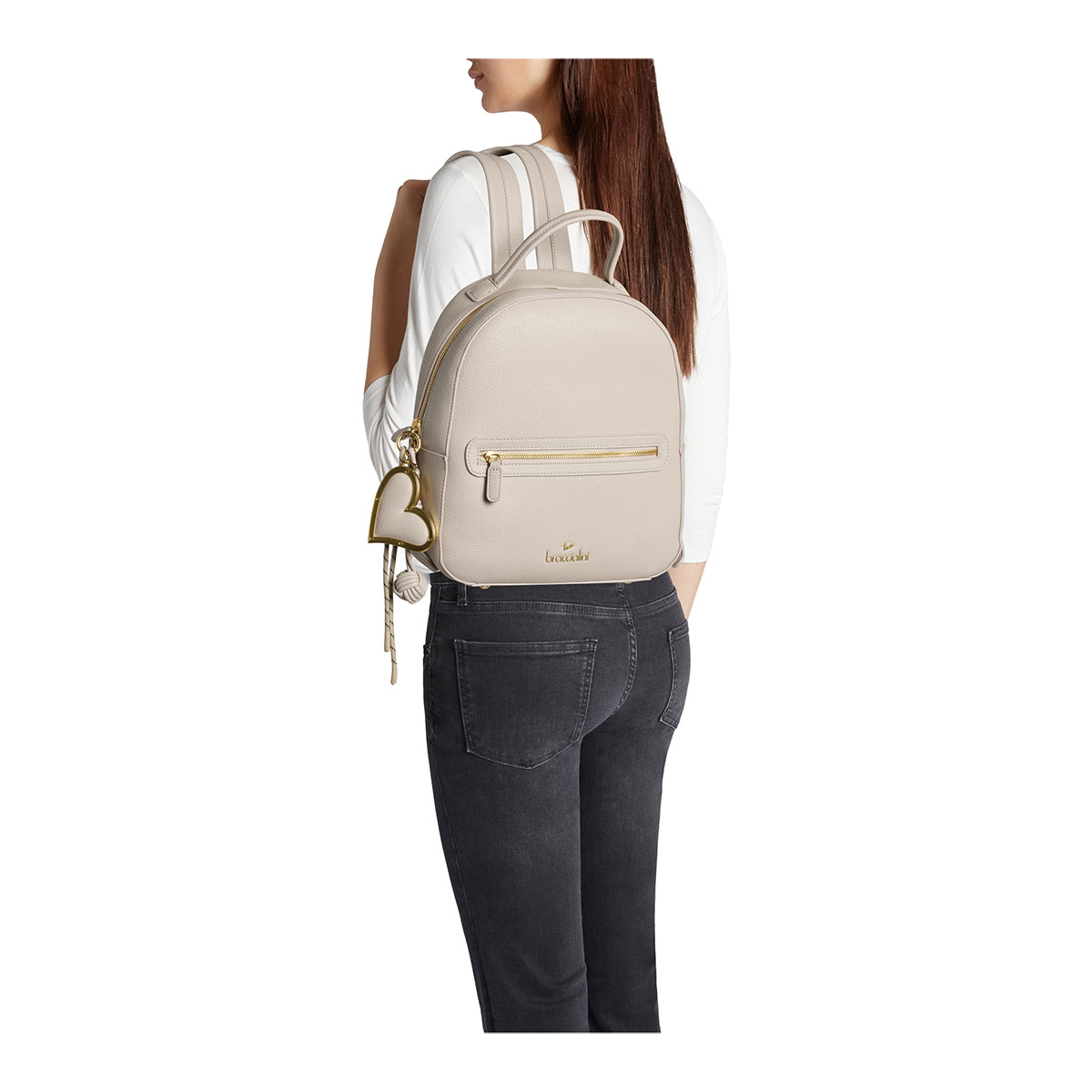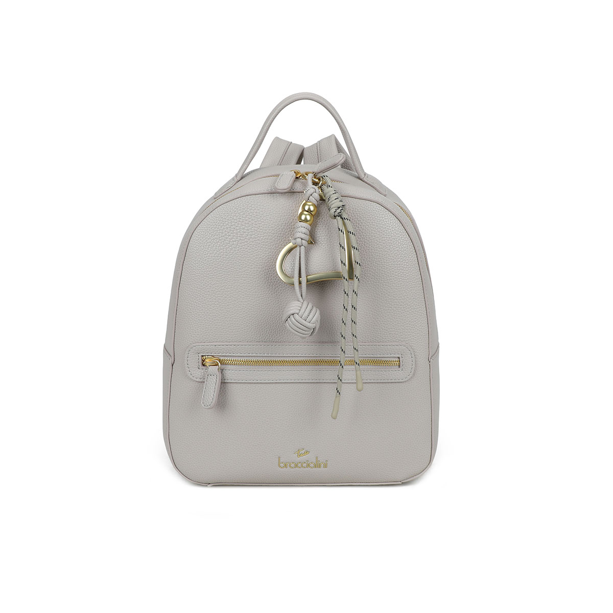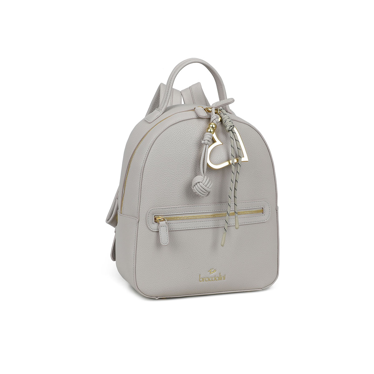 Compact, functional faux-leather backpack, enhanced by a removable maxi charm with a satin-finish gold heart and knotted cords. With adjustable shoulder straps and external zip pockets, it blends style and practicality to follow your every move throughout the day.