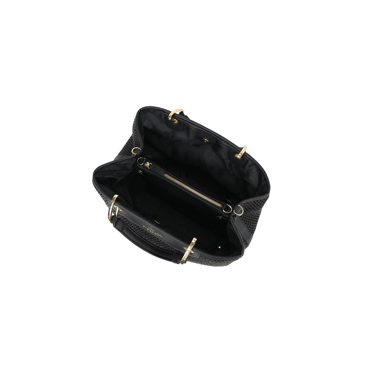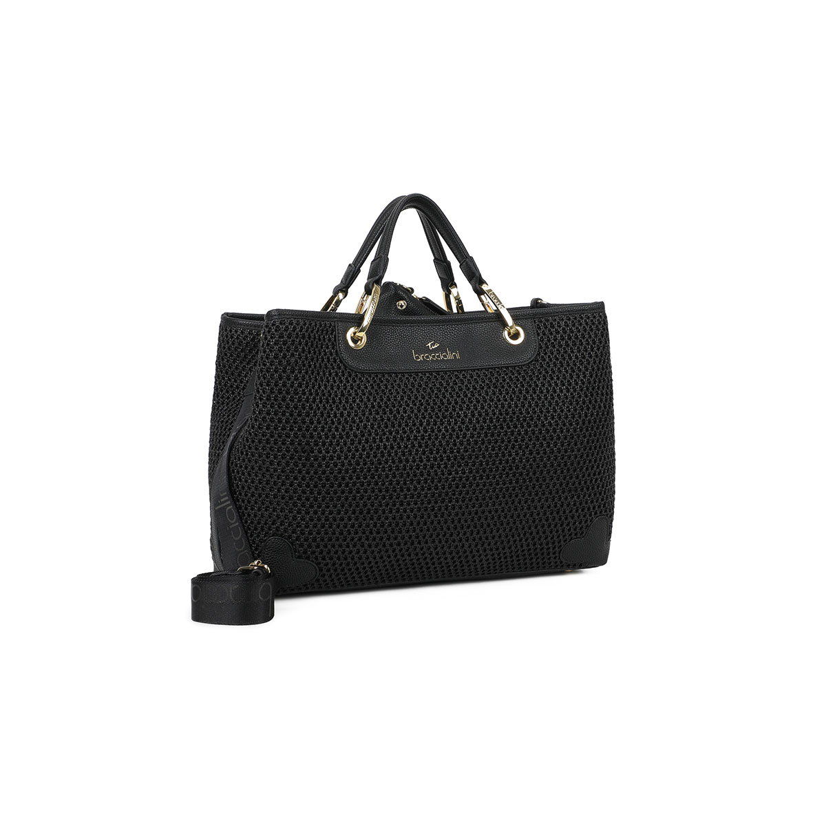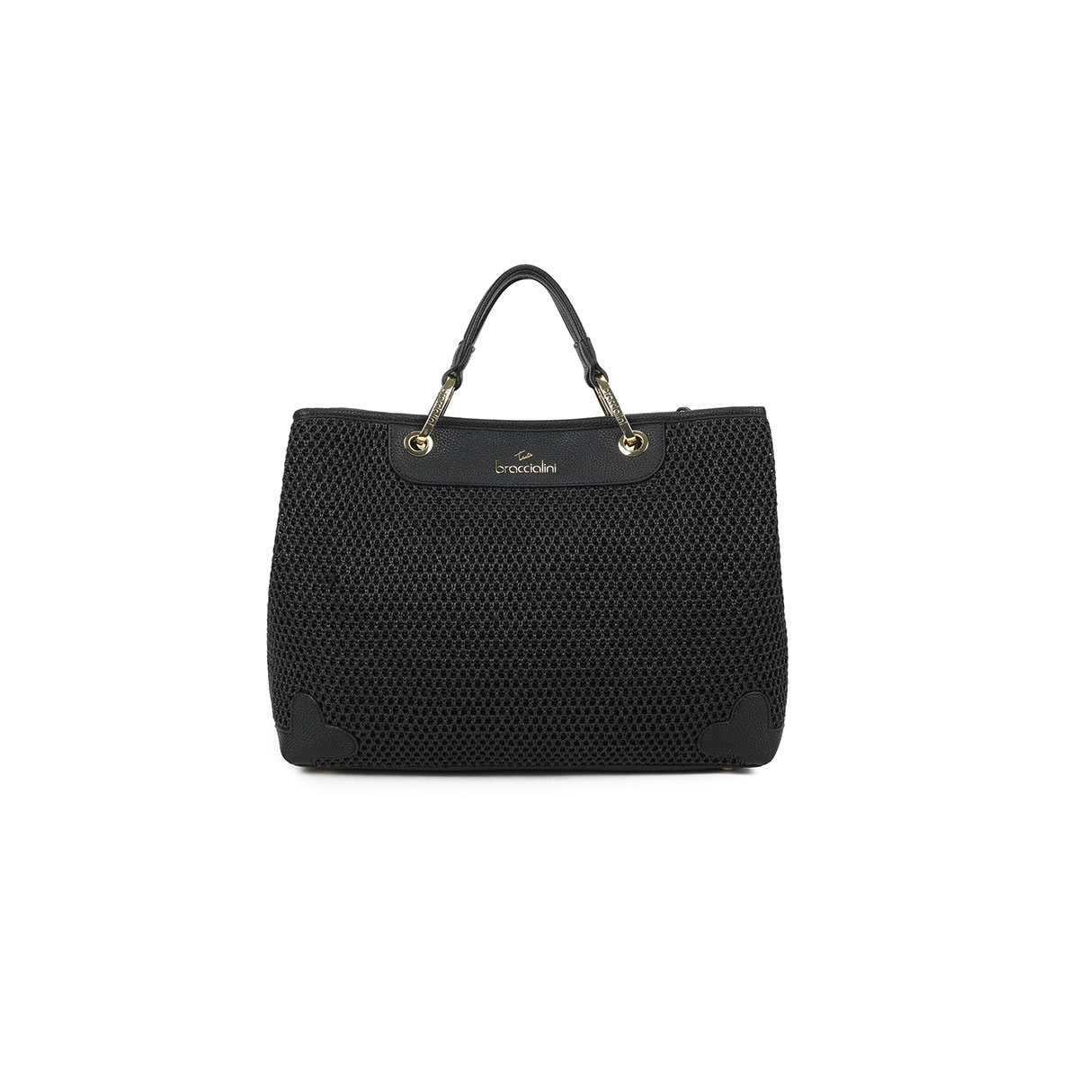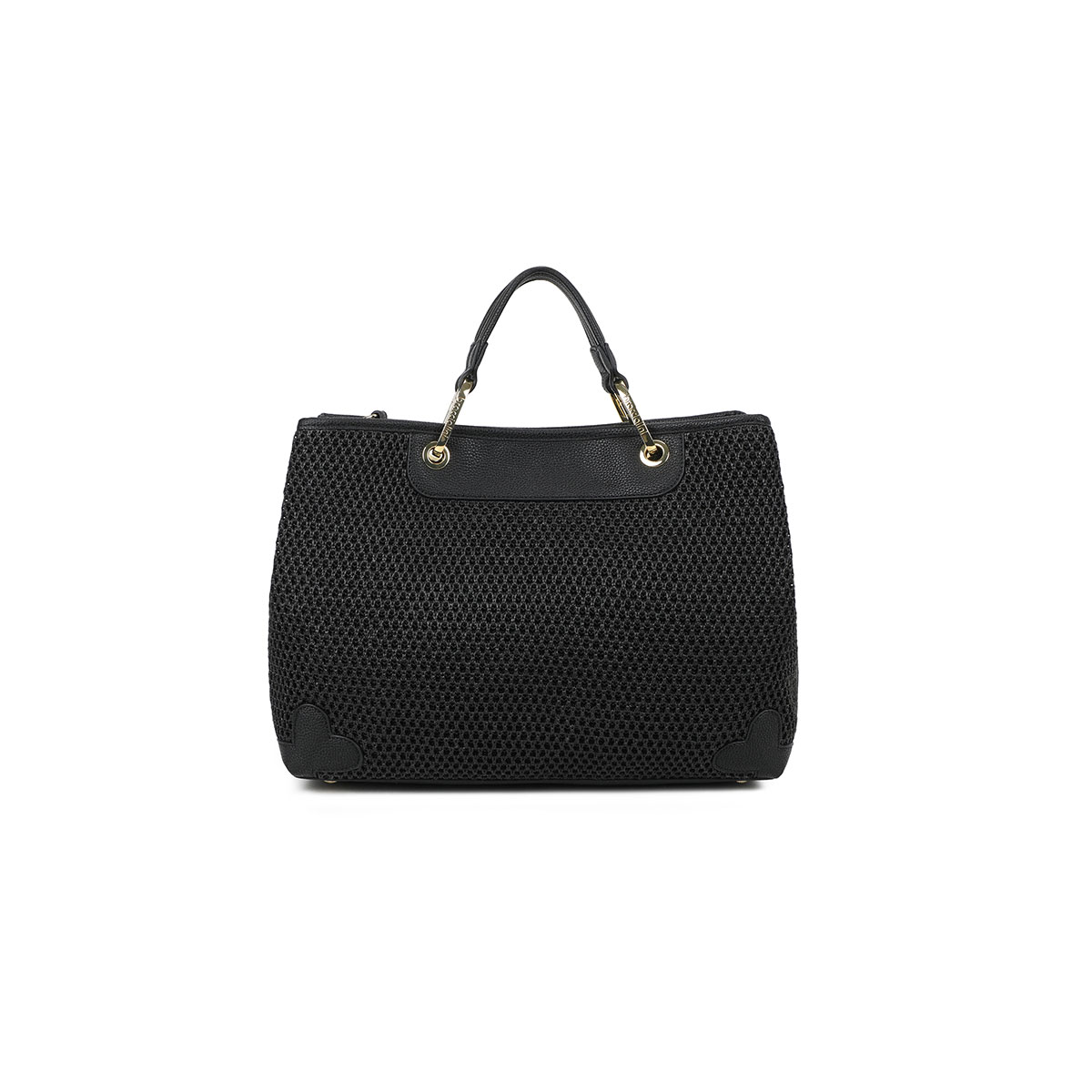 Large handbag in black straw-effect tricot fabric, with double handles and faux-leather details. The detachable, adjustable shoulder strap offers two ways to wear it—by hand or on the shoulder—to suit every moment of the day. Inside, a removable zip pouch that can double as a second bag when needed.