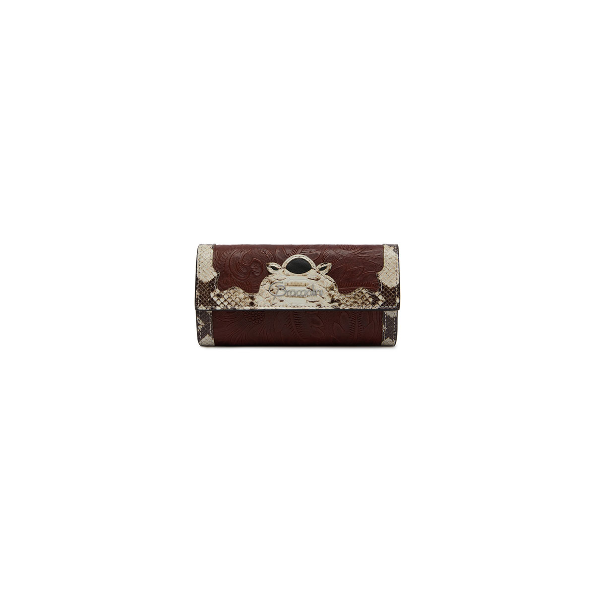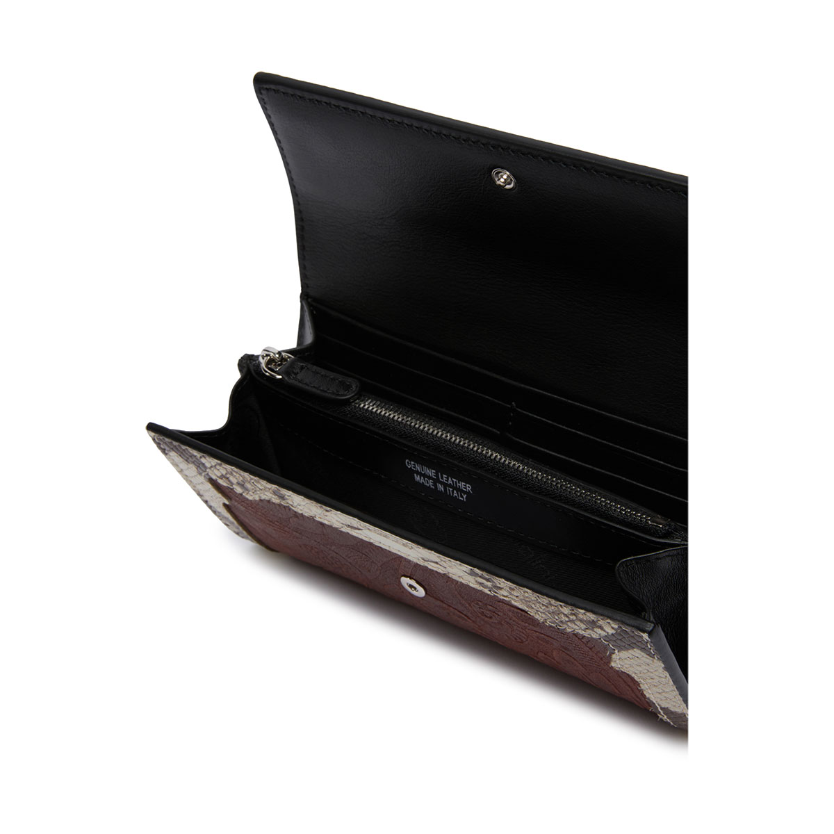 Leather continental wallet with clasp and golden logo detail. Interior coin pocket with zip closure. Seasonal prints come to life on its panels.