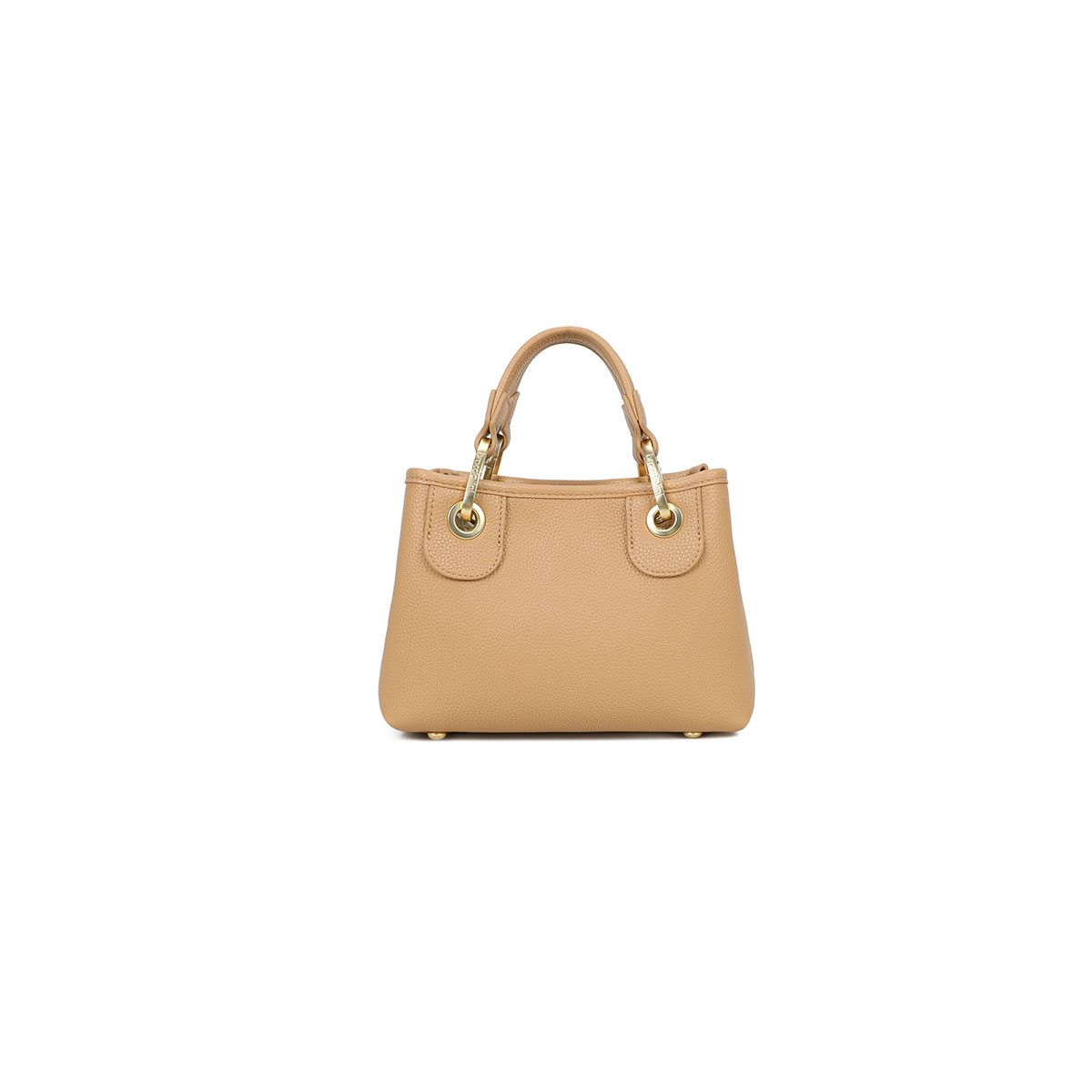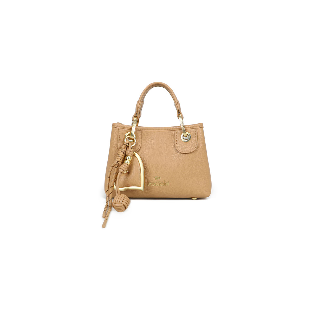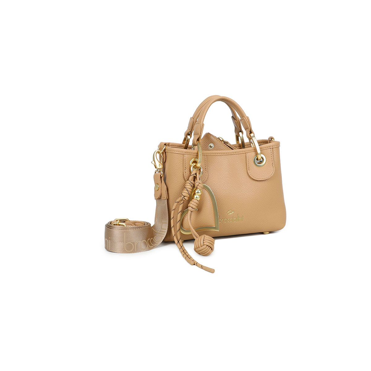 Small faux-leather handbag with a spacious, refined design. With double handles and a branded shoulder strap—adjustable and detachable—it offers two ways to wear it for versatile everyday use. Inside, there’s a handy removable zip pouch, perfect to use as a second bag. The removable multi-strand maxi charm with a satin-finish gold heart, matching the bag, adds a distinctive, iconic touch.