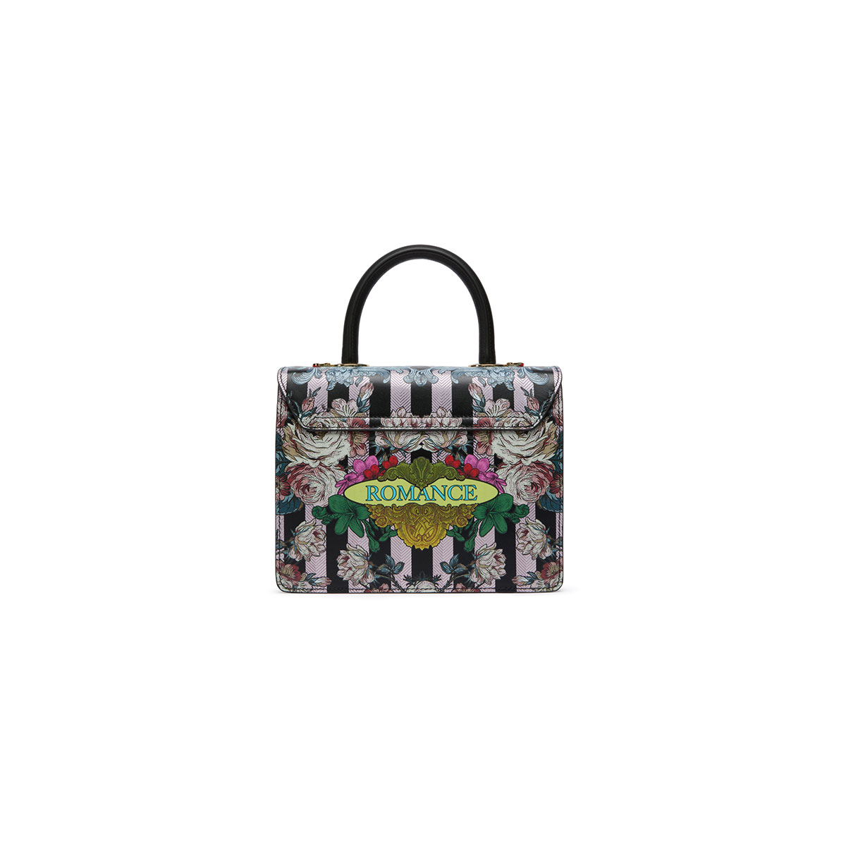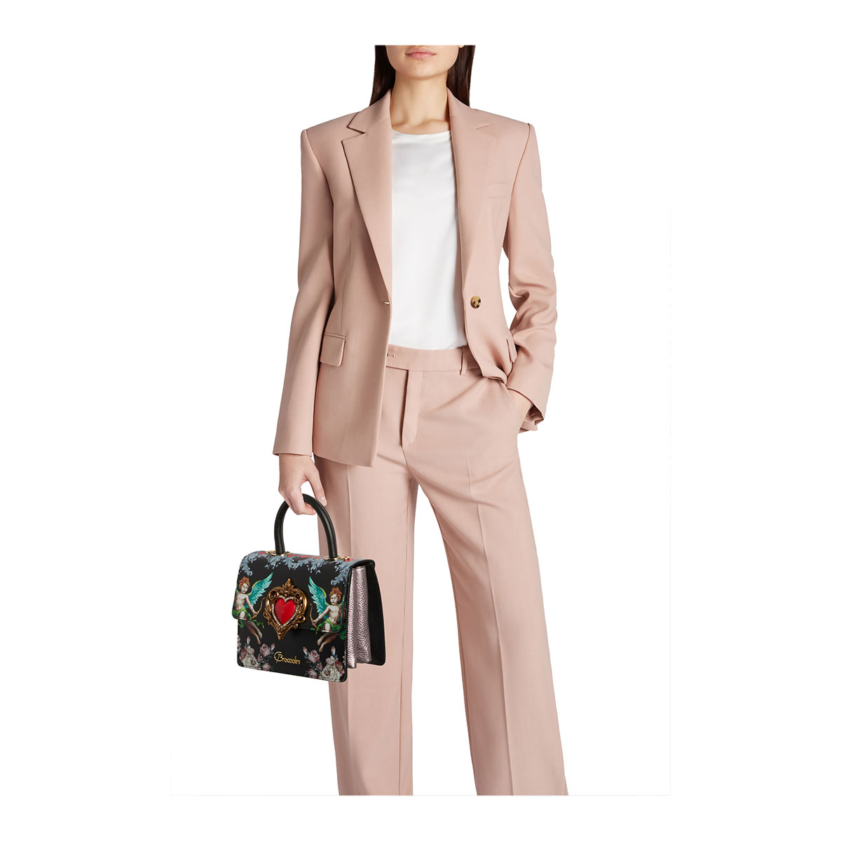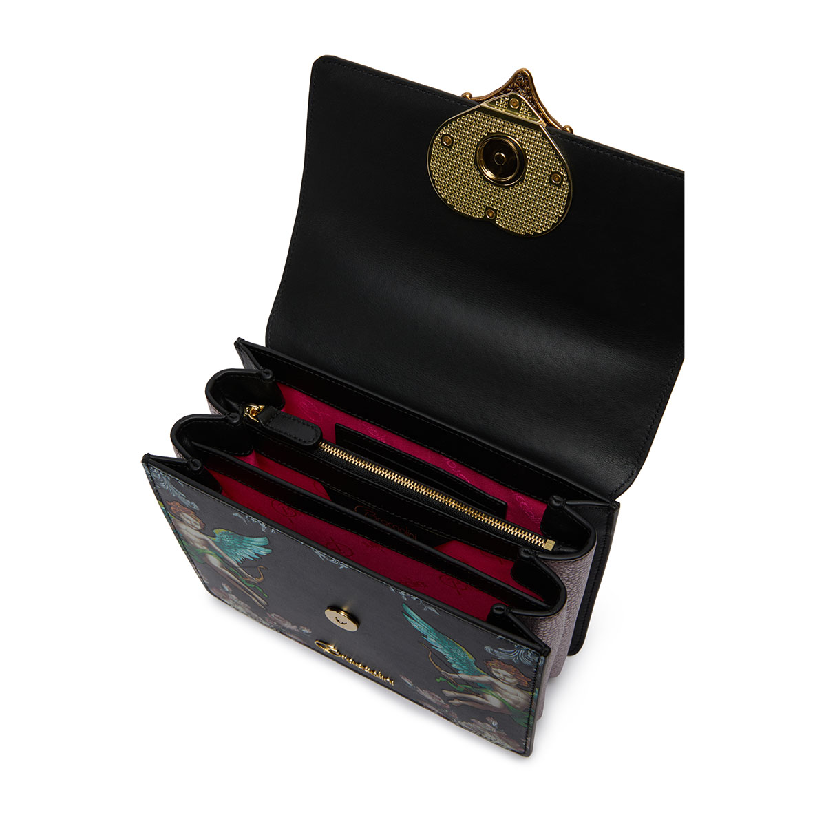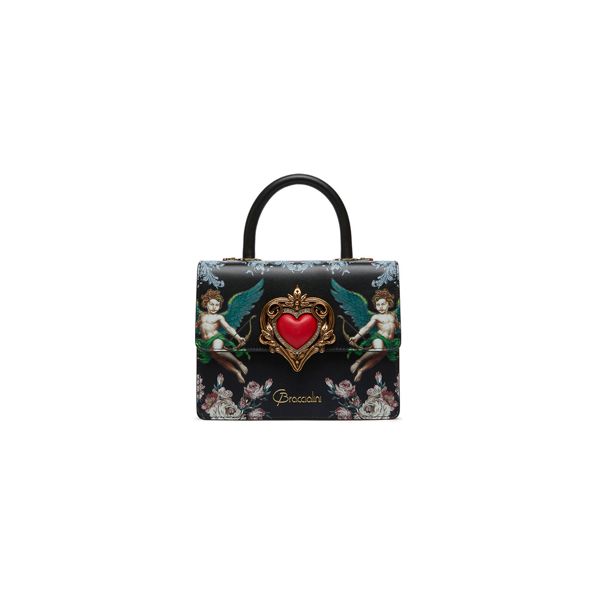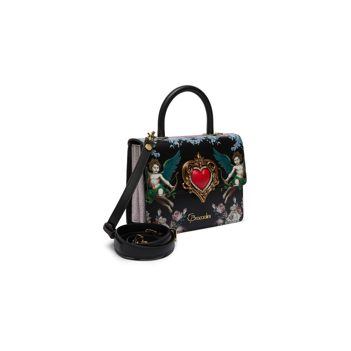Audrey Angeli embodies romantic elegance with the new seasonal print: on a black background, two winged angels shoot arrows of love, surrounded by refined floral motifs and baroque decorations. At the center, a raised heart framed by a golden jewel-style border captures the eye, adding depth and charm to the composition. Compact and sophisticated, the bag features an adjustable and removable strap for versatile wear. An accessory with a romantic yet bold character, designed to make an unforgettable impression.