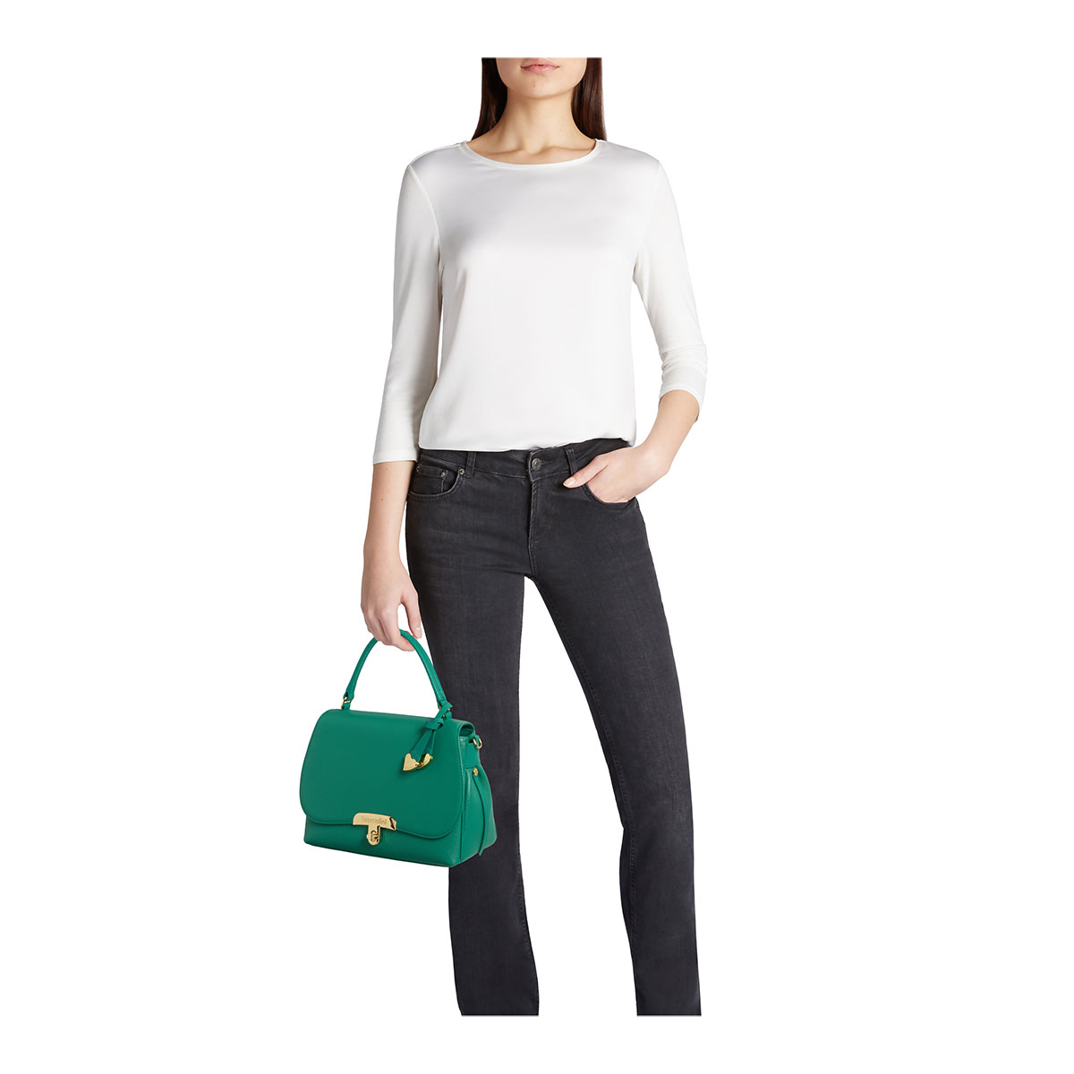Medium-sized handbag in soft emerald-green leather with an elegant and minimalist design. The structured silhouette with front flap is enhanced by a gold-tone turn-lock closure engraved with the logo. Featuring a top handle and a removable, adjustable shoulder strap, it offers dual carrying options, by hand or on the shoulder. A refined and versatile accessory, ideal for complementing any look with understated elegance. The design is completed by a leather charm with heart-shaped metal details, adding a romantic and distinctive touch.
