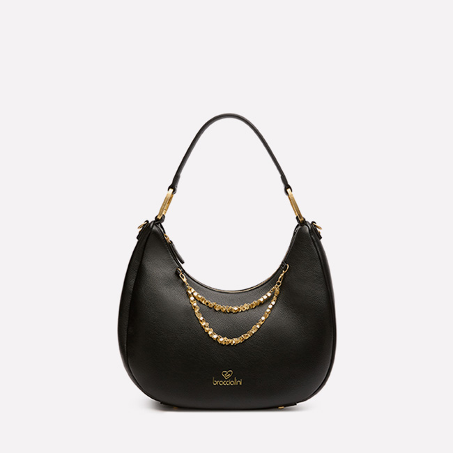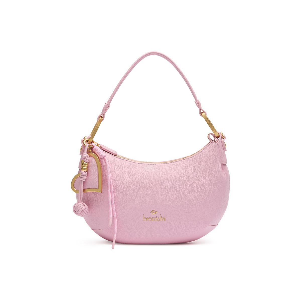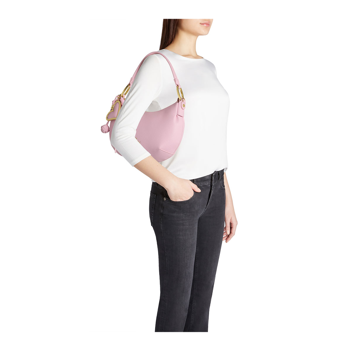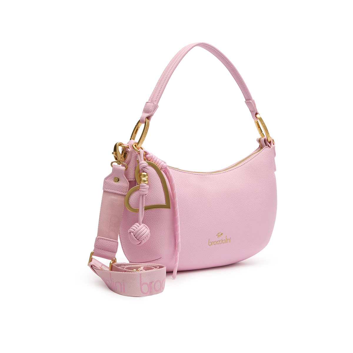 Hammered faux-leather shoulder bag with a half-moon design and a soft silhouette. The removable multi-strand maxi charm with a satin-finish gold metal heart, coordinated with the bag, adds an iconic touch. Comfortable to wear thanks to the single handle and the included branded shoulder strap, adjustable and detachable, it’s designed to accompany you every day with practicality and elegance.