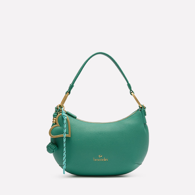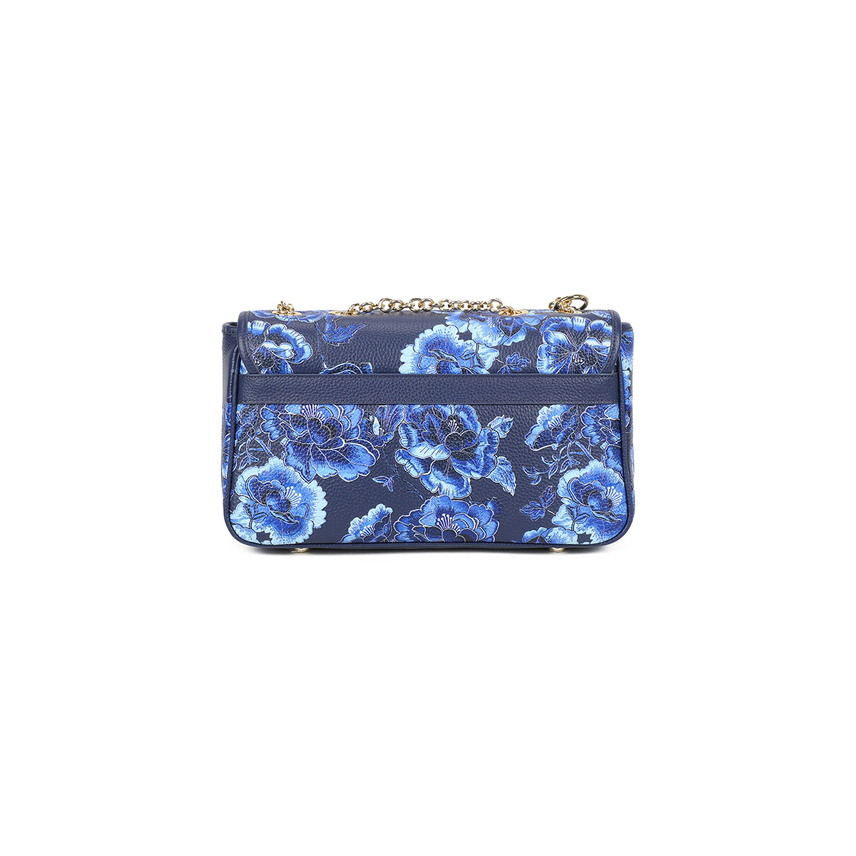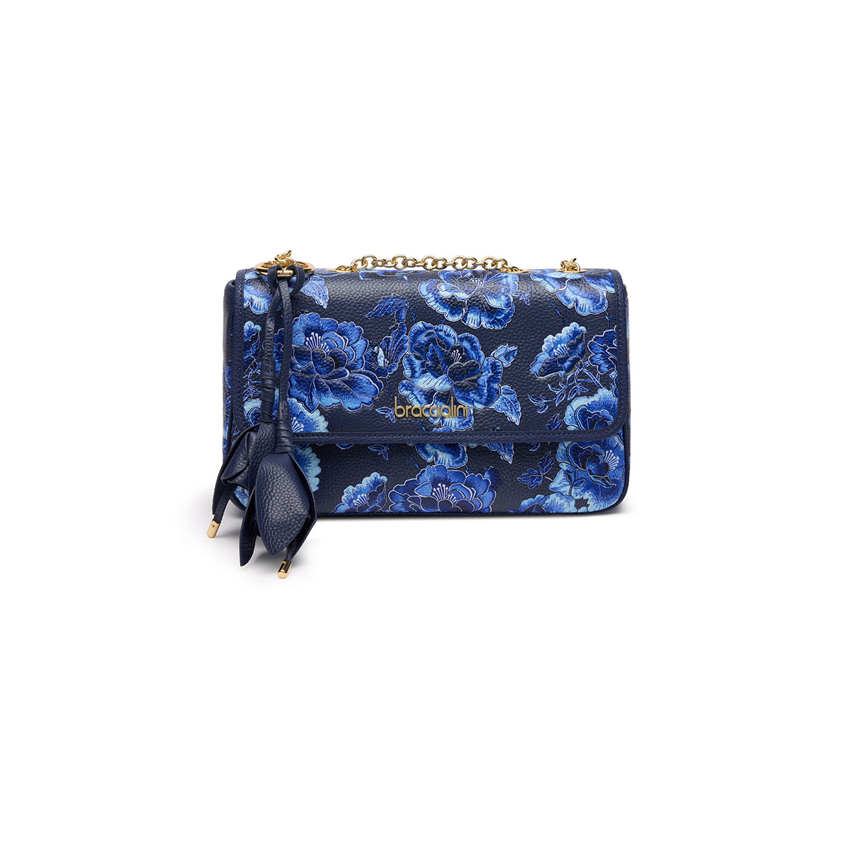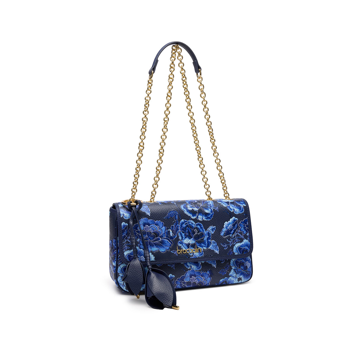 A harmony of shapes and colors defines this medium shoulder bag, where the elegance of the gold chain strap meets a sophisticated bloom in shades of blue. The clean, structured design finds its creative flourish in the leather charm: a pair of flowers that seem to blossom directly from the handle, adding three-dimensional movement and a touch of couture craftsmanship to an accessory made to stand out with grace.
