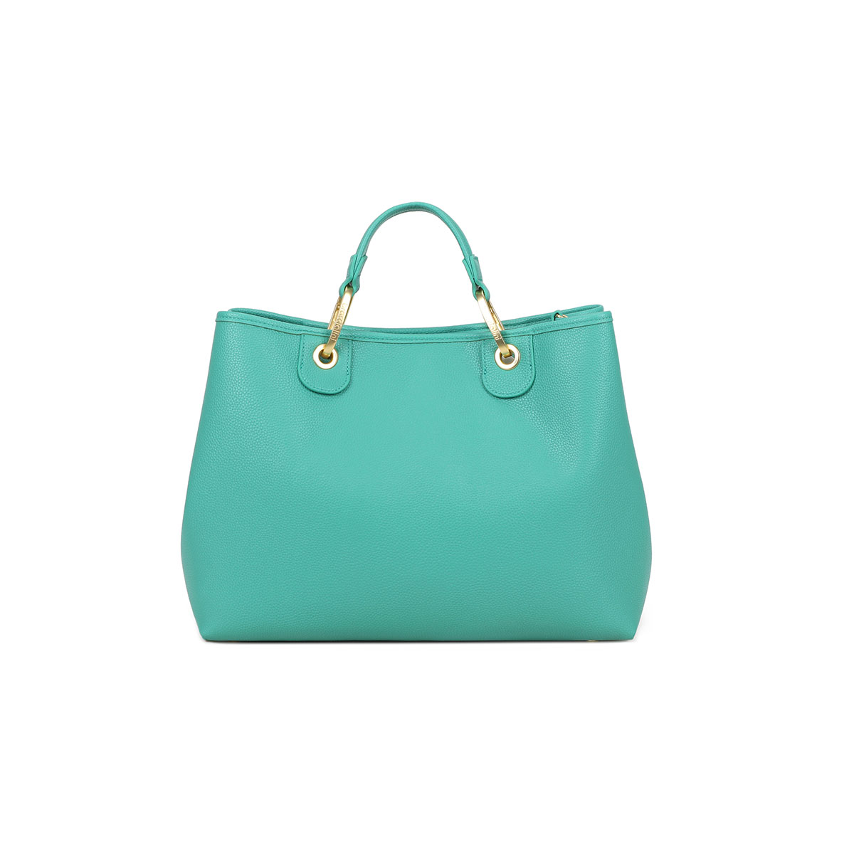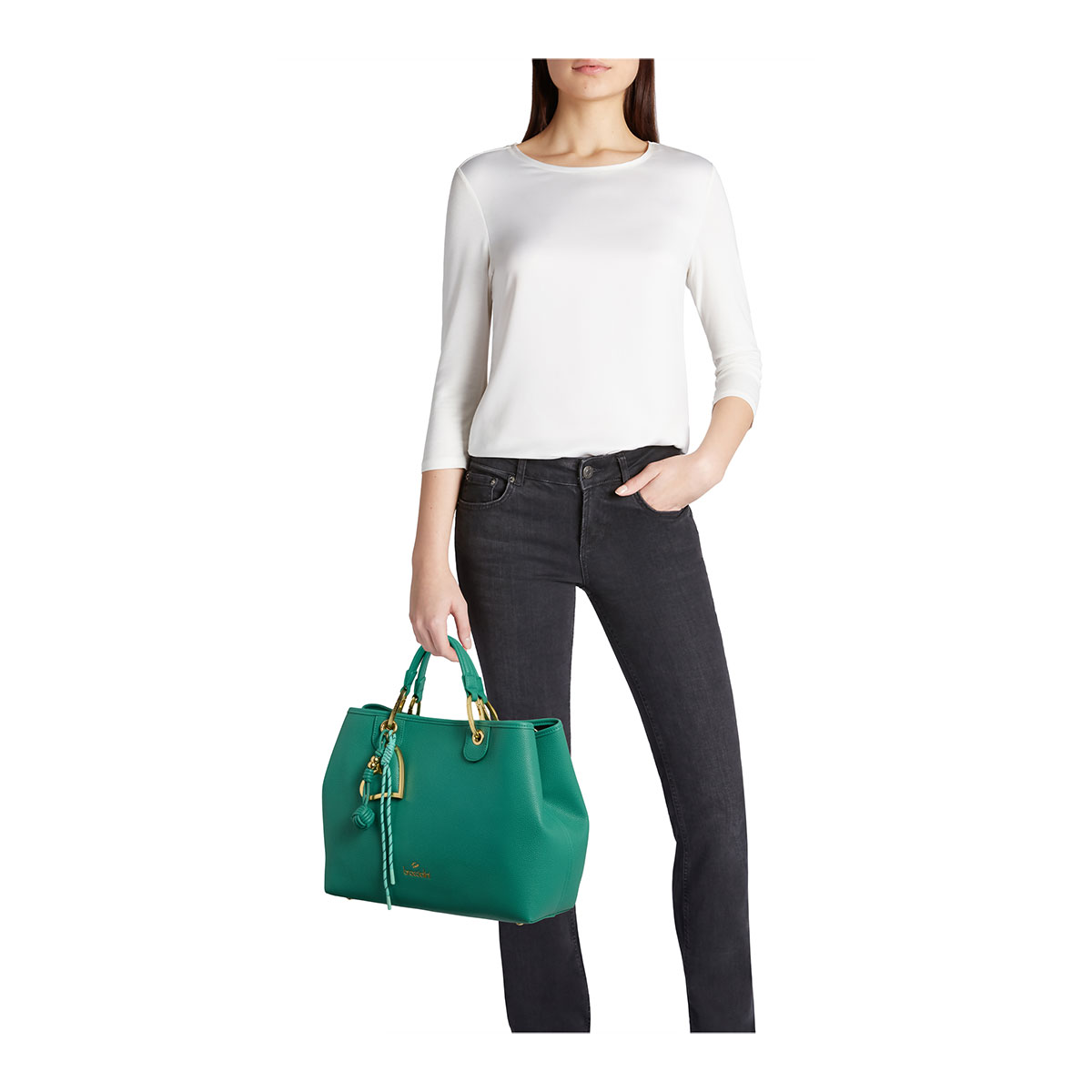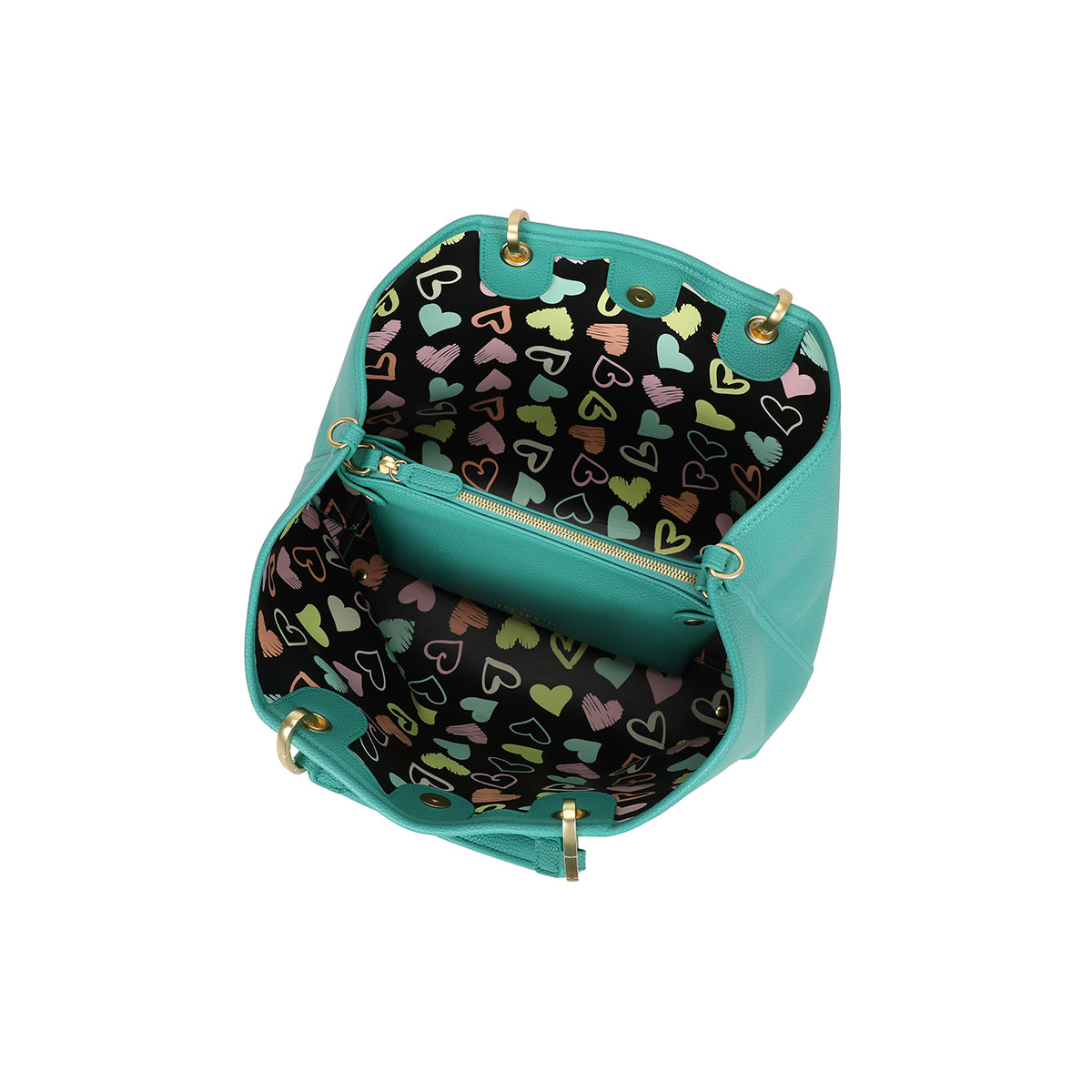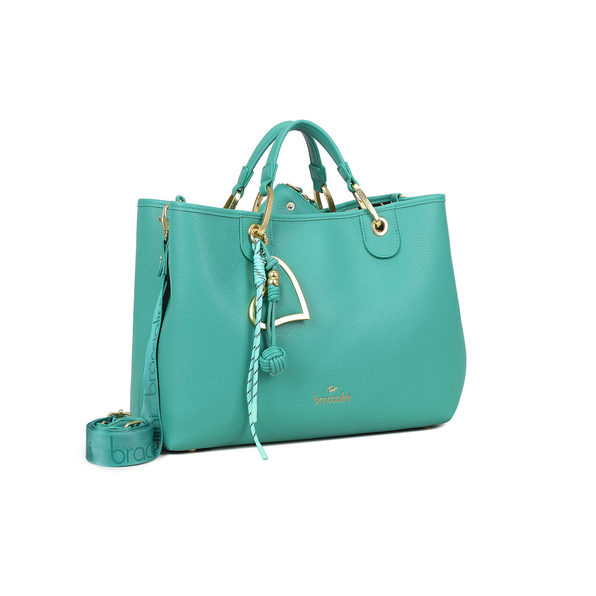 Large faux-leather handbag with a spacious, refined design. With double handles and a branded shoulder strap—adjustable and detachable—it offers two ways to wear it for versatile everyday use. Inside, there’s a handy removable zip pouch, perfect to use as a second bag. The removable multi-strand maxi charm with a satin-finish gold heart, matching the bag, adds a distinctive, iconic touch.