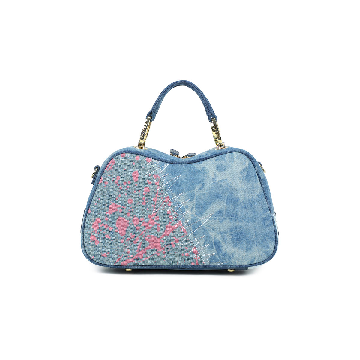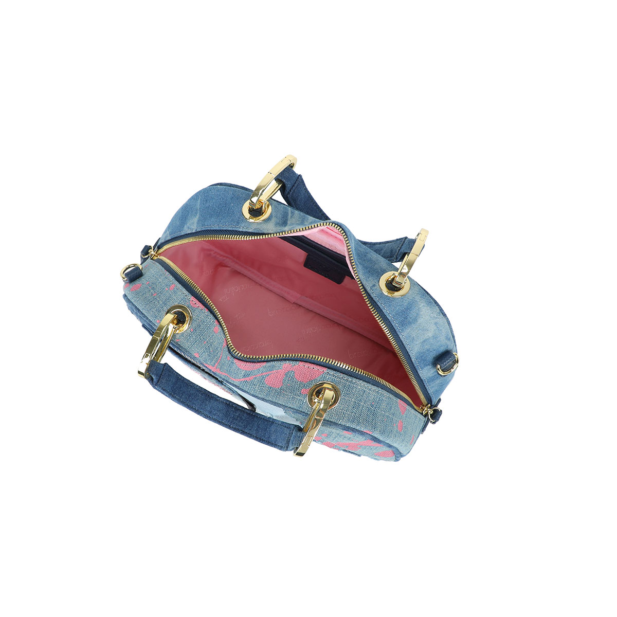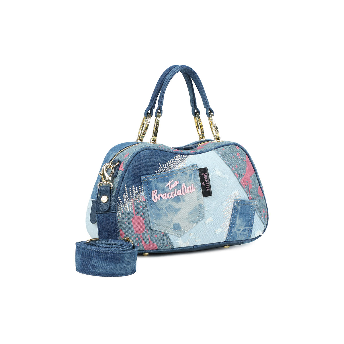 Bauletto in tessuto jeans, dal look vivace e originale, impreziosito da un patch creativo con effetto scolorito, ricami decorativi e stampa a schizzi di colore. Il modello è completato da una tasca applicata stile cinque tasche con logo Braccialini ricamato in rosa a contrasto. Dotato di doppi manici e tracolla in tessuto regolabile e rimovibile, per una doppia portabilità. Un accessorio dinamico e grintoso, perfetto per chi ama distinguersi con stile.