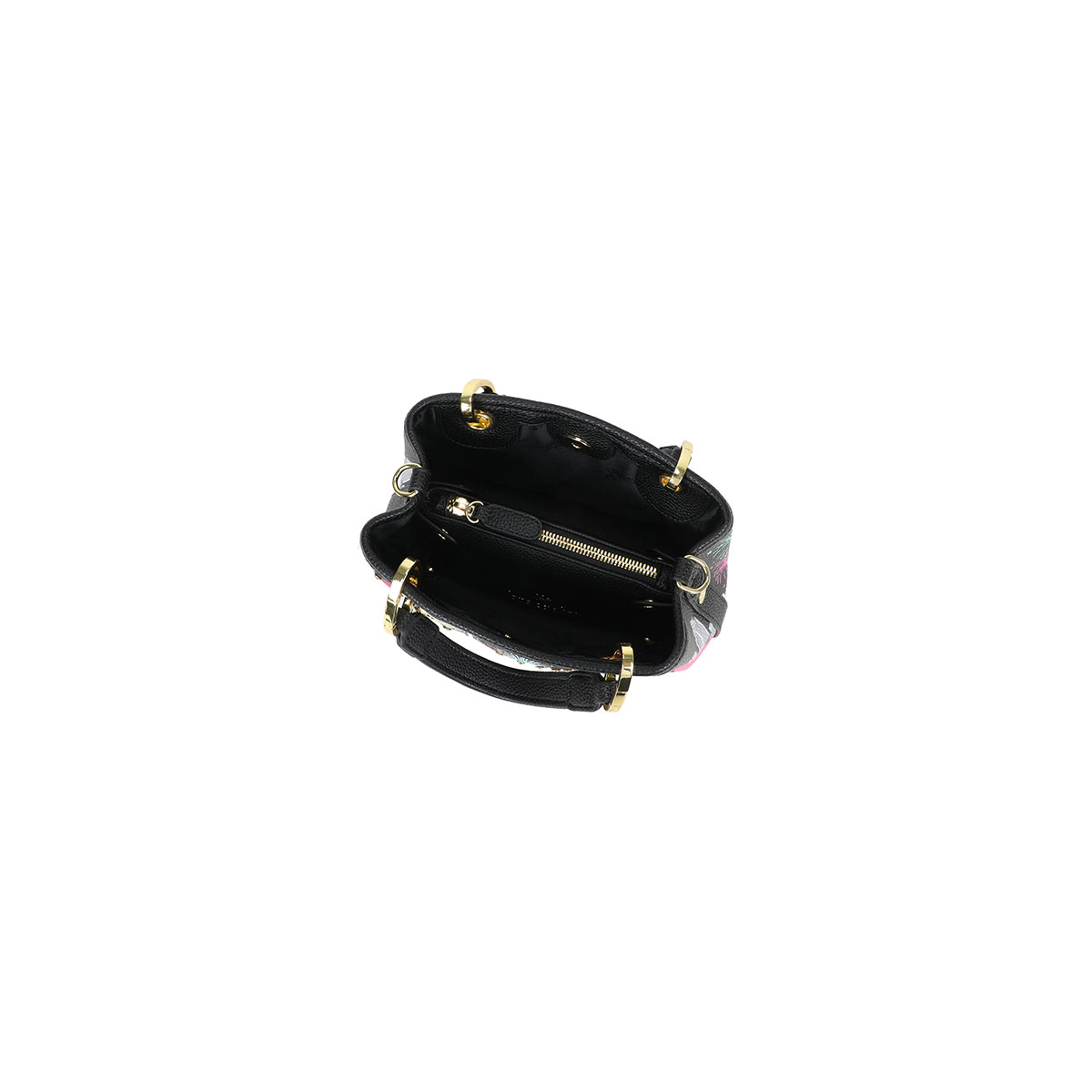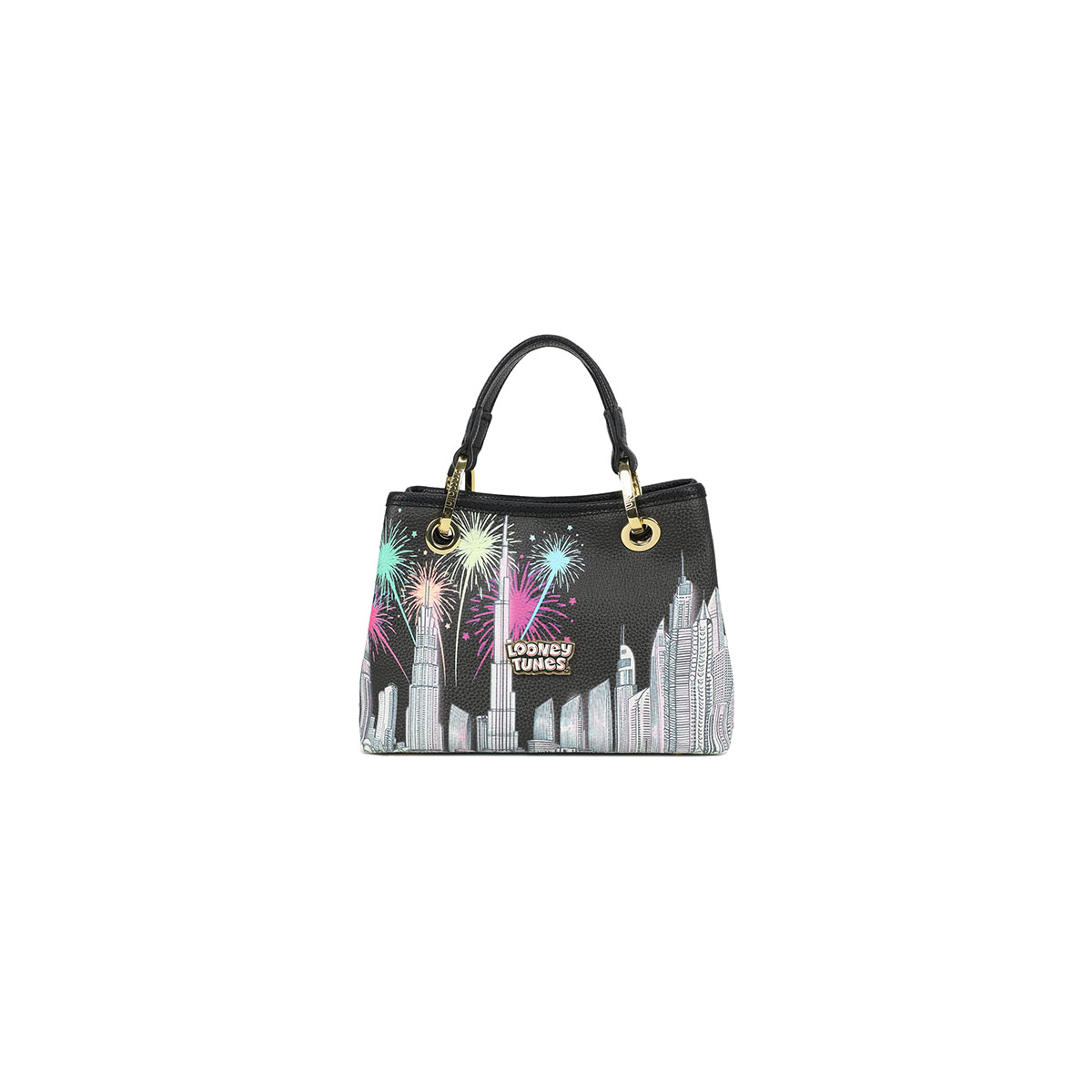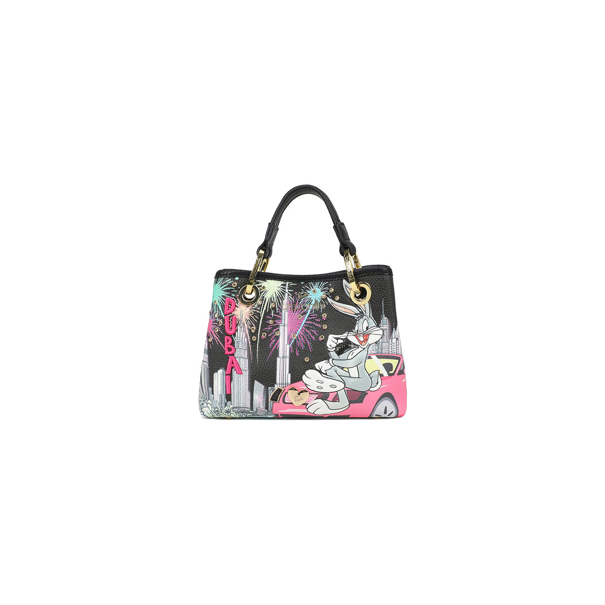 Handbag in faux leather with double handles and a logoed shoulder strap, adjustable and removable for practical, versatile dual carry options. The vibrant print features the iconic Bugs Bunny set against the Dubai skyline, surrounded by sparkling skyscrapers and spectacular fireworks. Three-dimensional embroidery and luminous appliqués add energy and personality to this original, playful accessory. Perfect for anyone who loves to be bold, stylish, and impossible to overlook.