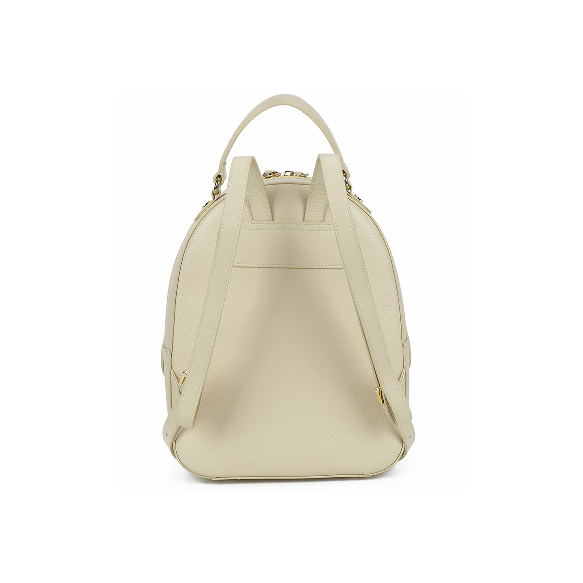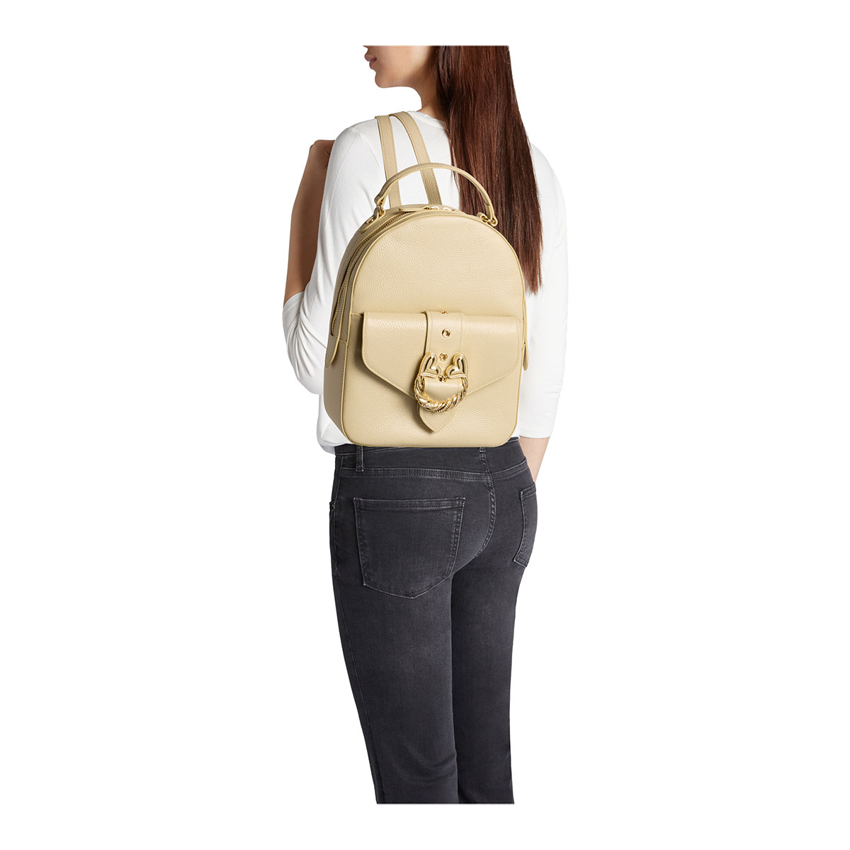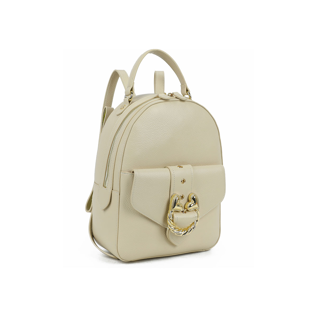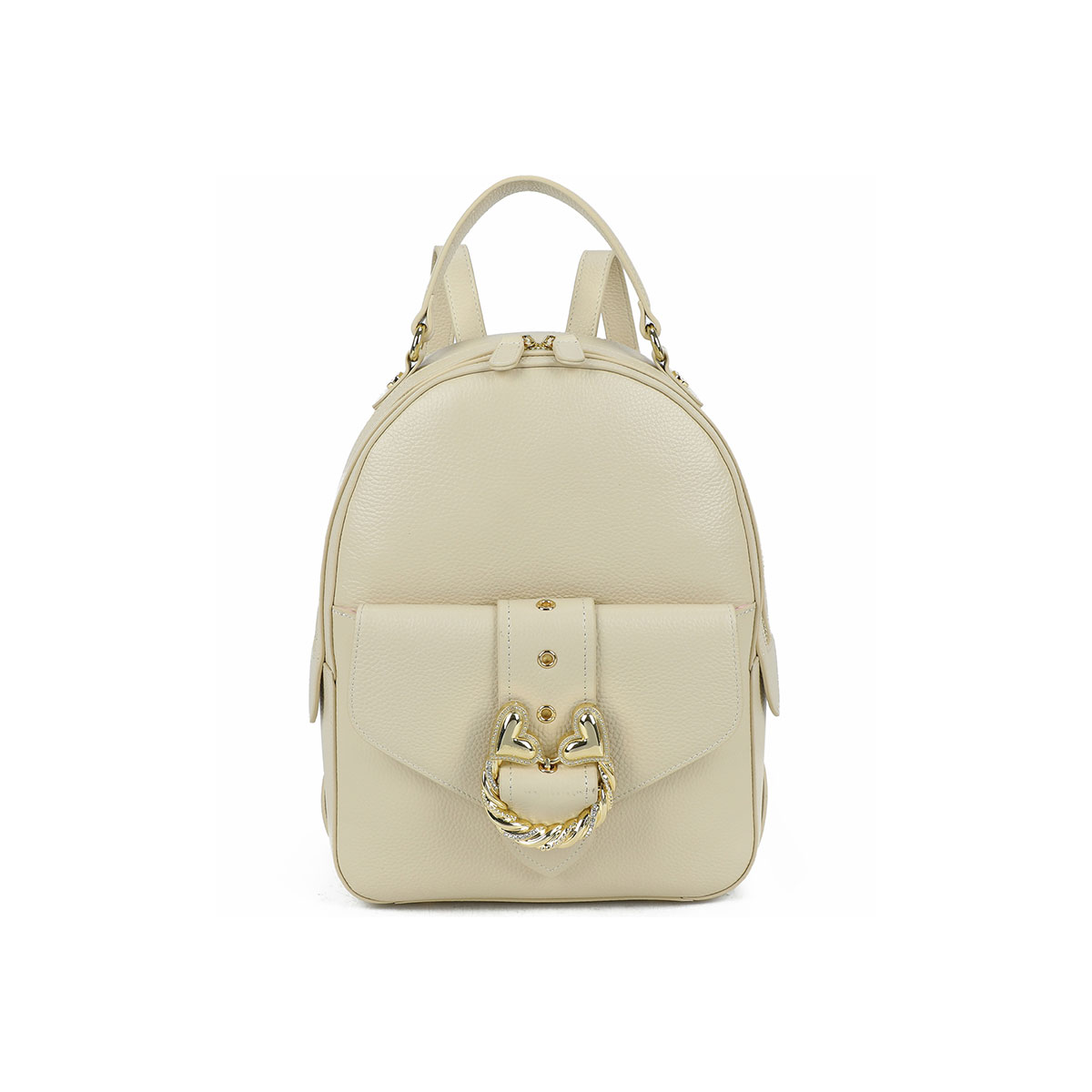 Semi-structured beige leather backpack with a feminine design. The gold-tone jeweled twisted-cord accessory with hearts takes center stage, adding a romantic, statement touch. Comfortable yet refined, it features adjustable shoulder straps and a top handle.