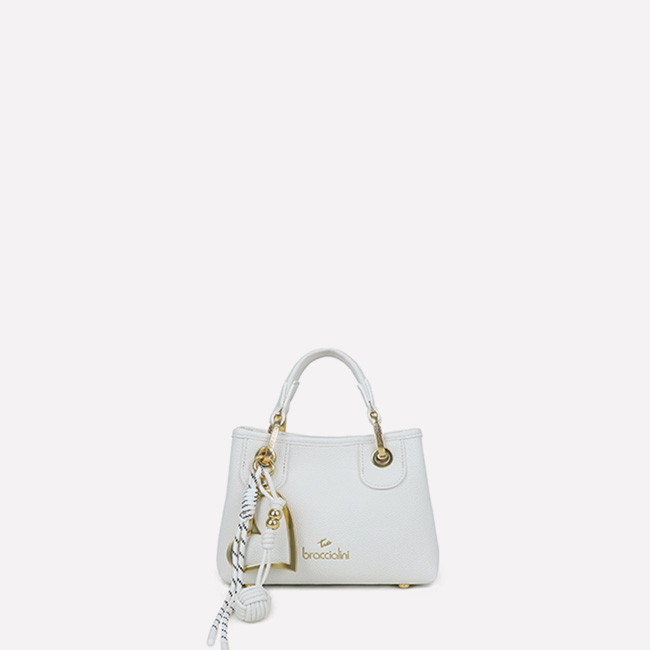 Medium white leather handbag with a compact, clean silhouette, elevated by an elegant jeweled closure: a gold-tone twisted cord with crystals and double hearts, the signature of the Baroque line. The single handle and the detachable, adjustable shoulder strap offer two ways to wear it—perfect for those who seek style and romance in every detail.
