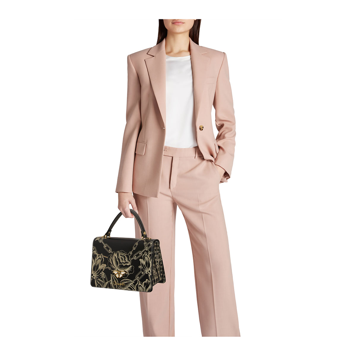 Leather handbag with top handle and removable, adjustable shoulder strap for dual carrying options. The elegant design is enhanced by a refined floral print with chain motifs on a black background, adorned with a jeweled butterfly appliqué. Romantic style meets sophisticated graphic details, creating a feminine, distinctive accessory perfect to complete chic and contemporary looks.