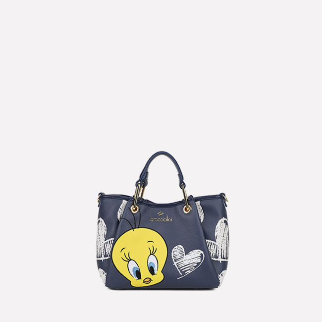 Small-sized handbag in black, featuring double handles and a removable, adjustable logoed shoulder strap for dual carrying options. Inside, a detachable pouch can be used as a second bag. The design is enhanced by an elegant jewel ladybug, a symbol of luck and style.