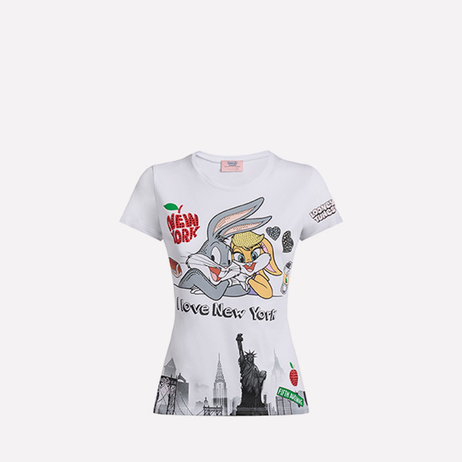 Camiseta de manga corta decorada con un estampado romántico ambientado en París. En primer plano, el adorable Tweety mira soñadoramente la Torre Eiffel decorada con strass brillantes, rodeado de corazones y detalles gráficos estilo cartoon. |