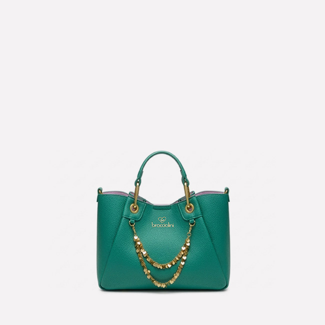 Bolso de mano pequeño de piel color oro, de silueta compacta y limpia, realzado por un elegante cierre joya: un torzón dorado con cristales y dobles corazones, símbolo de la línea Baroque. El asa única y la bandolera regulable y extraíble ofrecen dos formas de llevarlo, perfecto para quienes buscan estilo y romanticismo en cada detalle.