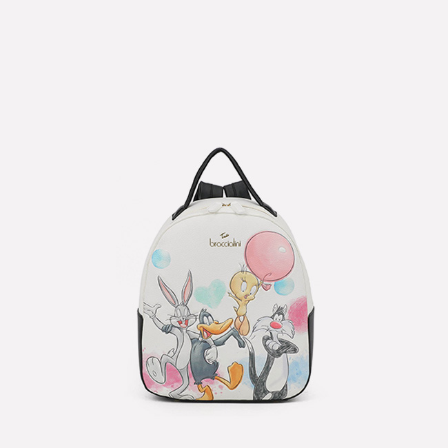 Mochila en color negro con tirantes ajustables para ofrecer el máximo confort y versatilidad. El diseño se realza con una profusión de tachuelas doradas que representan corazones, mariposas, globos aerostáticos y nubes, cubriendo toda la superficie y creando un efecto brillante y lleno de personalidad.
