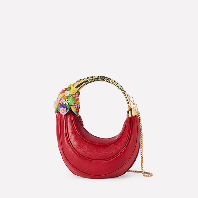 Bolso de hombro en forma de media luna de tamaño mediano-pequeño realizado en suave piel sintética. En el cuadrante frontal se ha colocado una deliciosa mariposa dorada con cristales. Bolso interior tipo «pochette» extraíble y bandolera desmontable y ajustable.