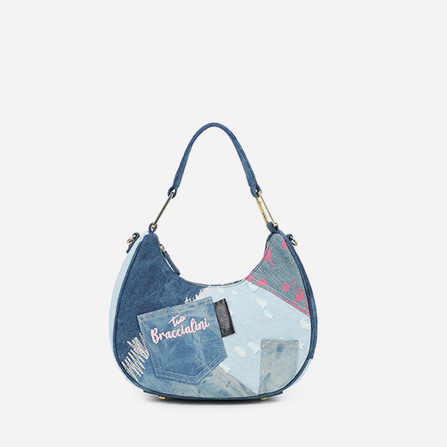 Bolso de mano grande confeccionado en tejido, con doble asa y bandolera ajustable y extraíble para una doble portabilidad. El bordado, elegante y escenográfico, se despliega en motivos barrocos de líneas sinuosas sobre un fondo negro, creando un refinado contraste bicolor. El logotipo Braccialini se integra perfectamente en el centro de la composición, enmarcado por franjas decorativas. En el interior, una práctica pochette extraíble añade funcionalidad a un accesorio de carácter decidido y sofisticado.